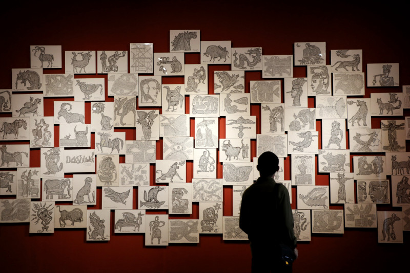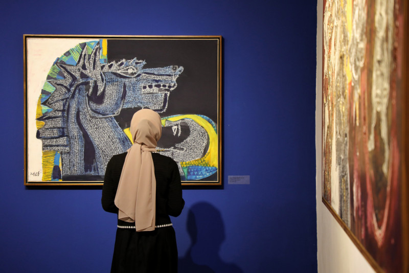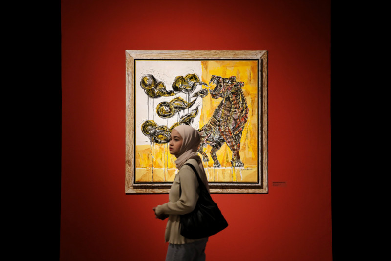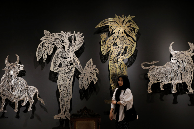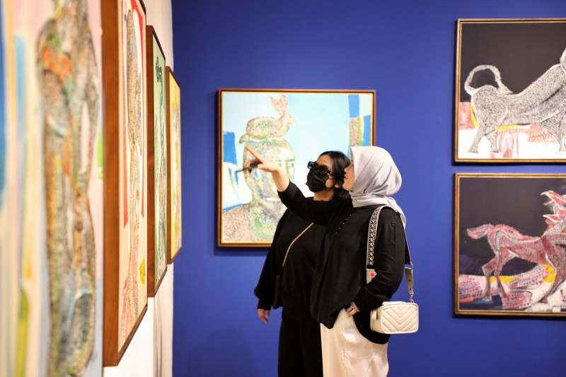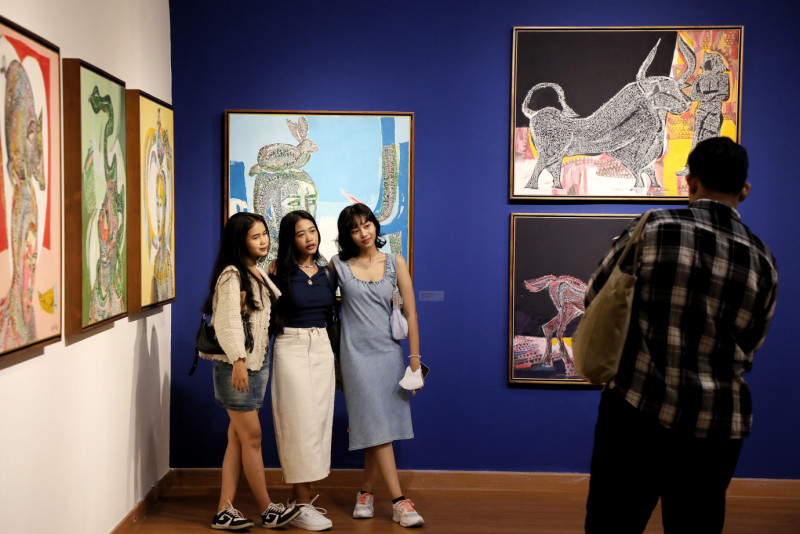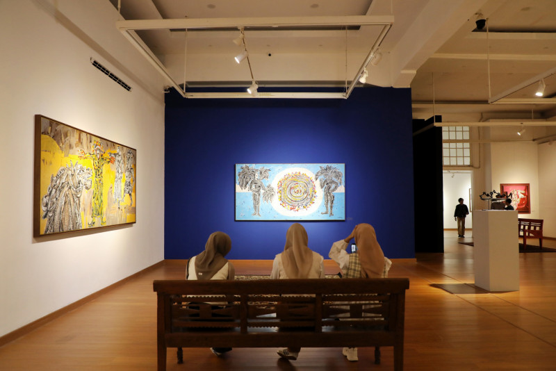 Menyaksikan pameran tunggal Butet Kartaredjasa di Galeri Nasional Indonesia (GNI), Gambir, Jakarta Pusat, Kamis (2/5). Pameran tunggal dengan tajuk Pameran Seni Rupa Butet Kartaredjasa: “Melik Nggendong Lali” ini berlangsung pada 26 April - 25 Mei 2024 di Gedung A Galeri Nasional Indonesia.