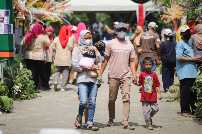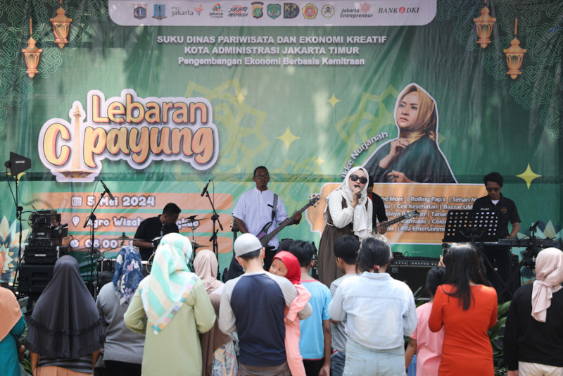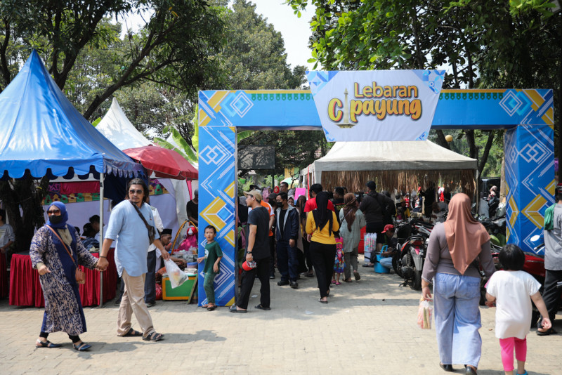Sejumlah warga mengunjungi acara Lebaran Cipayung di Agro Wisata Cilangkap, Cipayung, Jakarta Timur, Minggu (5/5). Acara yang berlangsung pada 4-5 Mei 2024 ini terselenggara berkat kerja sama Karang Taruna Kecamatan Cipayung dengan Sudin Kebudayaan dan Sudin Pariwisata dan EkonomI Kreatif (Parekraf) Jakarta Timur.