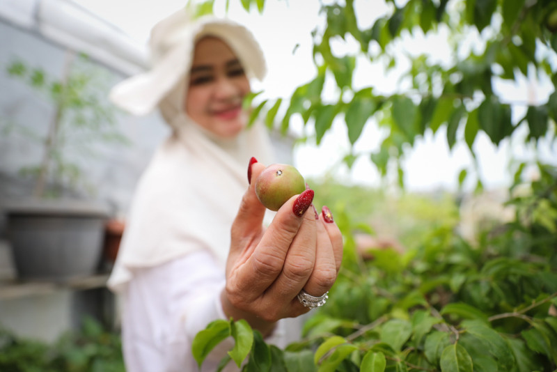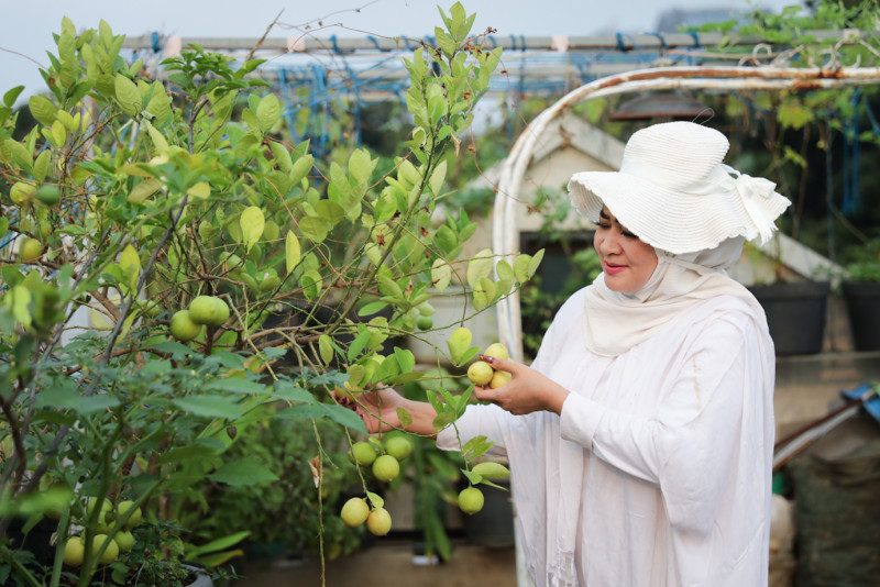 Seorang warga Kelurahan Pancoran, Nuraini memanfaatkan lantai atap (rooftop) rumahnya di Jalan Pancoran Barat IX RT 10 RW 04, Pancoran, Jakarta Selatan, Selasa (7/5). Rooftop seluas 110 meter persegi sebagai lokasi pertanian perkotaan (urban farming) untuk menanam berbagai jenis tanaman buah dan sayur secara mandiri.