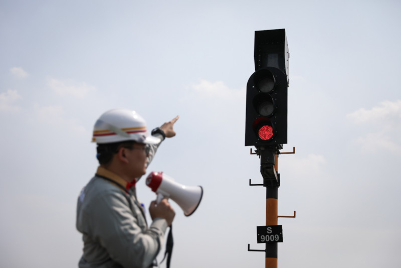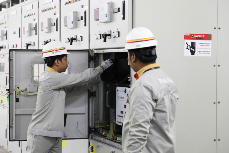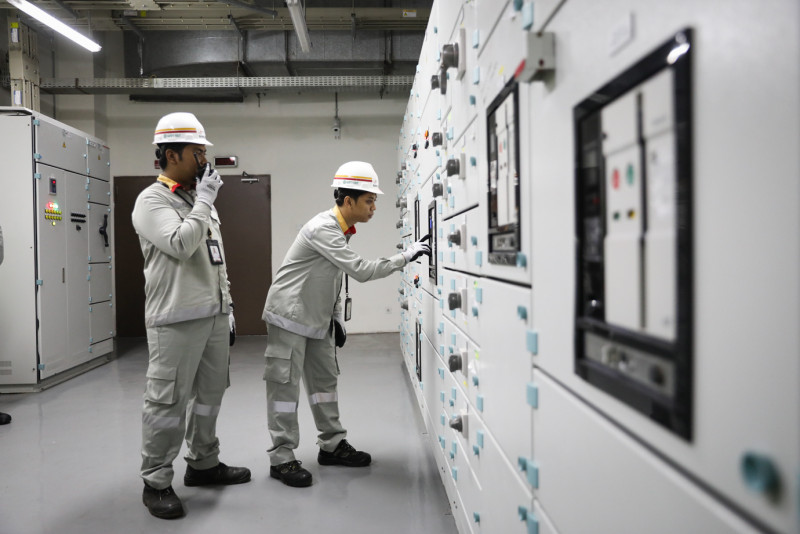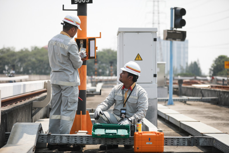 Sejumlah petugas melakukan perawatan prasarana LRT Jakarta di Depo LRT Pegangsaan Dua, Kelapa Gading, Jakarta Utara, Rabu (8/5). Perawatan tersebut meliputi pengecekan dan pemeliharaan berkala utilitas di dalam Auxiliary Power Sub Station (APSS) dan jalur rel, lampu sinyal serta fungsi automatic train stop (ATS) ballise.