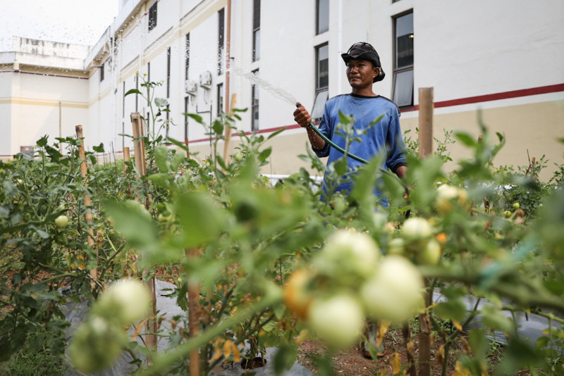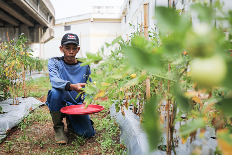Petugas yang tergabung dalam Kelompok Tani (Poktan) LRT Jakarta melakukan budi daya tanaman buah dan sayur di kawasan Depo LRT Jakarta Pegangsaan Dua, Kelapa Gading, Jakarta Utara, Rabu (8/5). LRT Jakarta memanfaatkan lahan hijau seluas 4.590 meter persegi untuk pembudidayaan beragam tanaman seperti cabai, tomat, kangkung, pisang dan sebagainya.