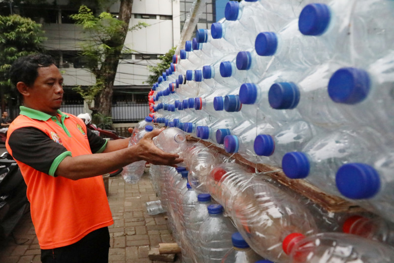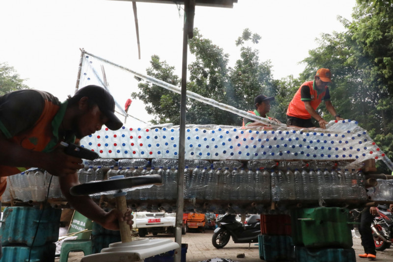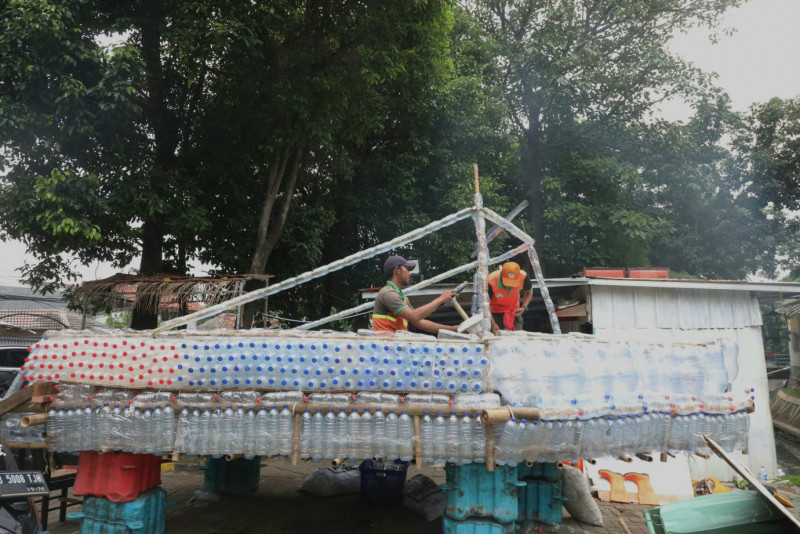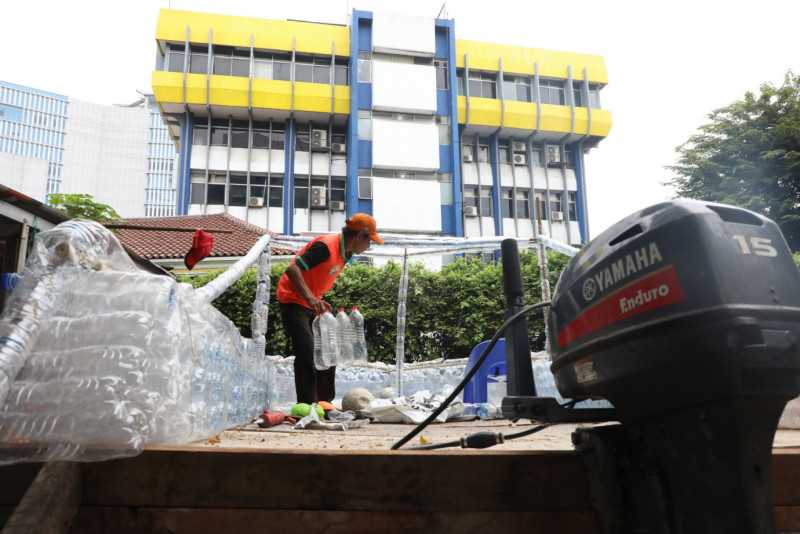 Petugas Unit Penanganan Sampah (UPS) Badan Air Dinas Lingkungan Hidup (DLH) Kecamatan Matraman membuat perahu air yang terbuat dari botol bekas di Pos Badan Air Dinas Lingkungan Hidup Kecamatan Matraman Komplek Kehakiman, Jalan Pengayoman, Utan Kayu Utara, Jakarta Timur, Selasa (14/5). Dalam pembuatan perahu air ini petugas memanfaatkan 2.177 botol bekas yang terdiri dari 2.000 botol air mineral dan 177 galon bekas yang didapat dari aliran kali dan pengumpulan bank sampah warga.