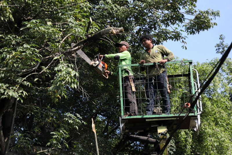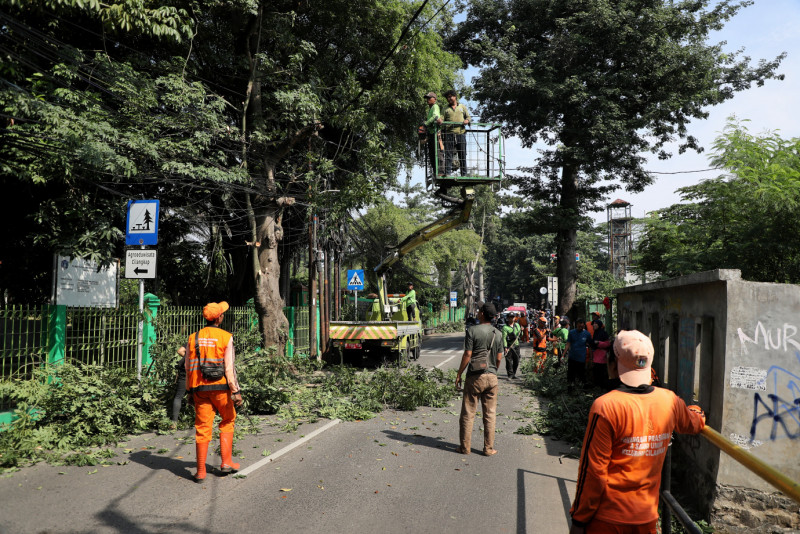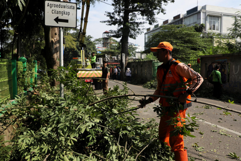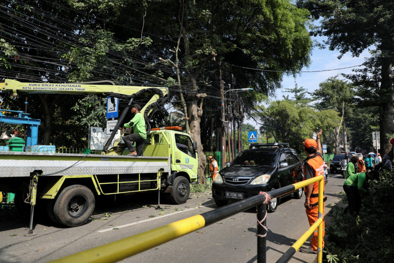 Petugas Gabungan Lakukan Penopingan Pohon di Jalan Raya Cilangkap