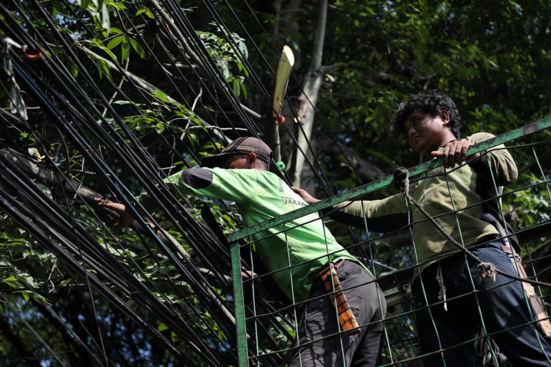 Petugas gabungan terdiri dari Suku Dinas (Sudin) Pertamanan dan Hutan Kota Jakarta Timur serta PPSU Kelurahan Cilangkap melakukan penopingan di Jalan Raya Cilangkap, Cipayung, Jakarta Timur, Rabu (15/5). Sebanyak enam pohon kapuk ditoping agar tidak membahayakan pengendara yang lewat.