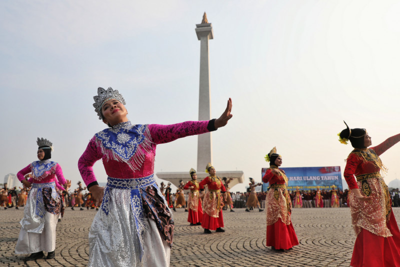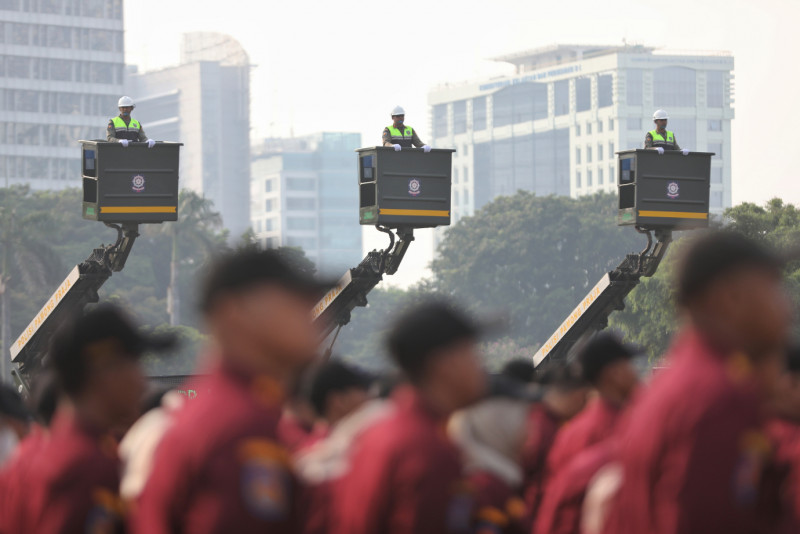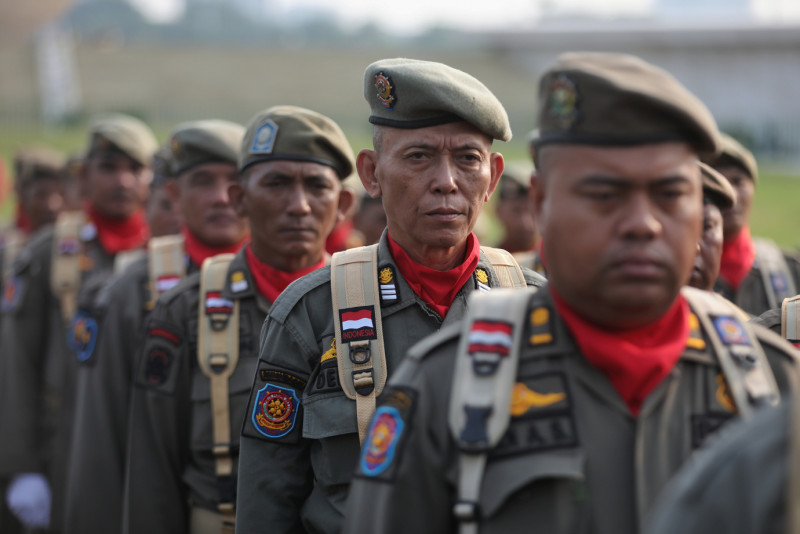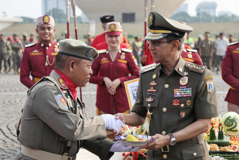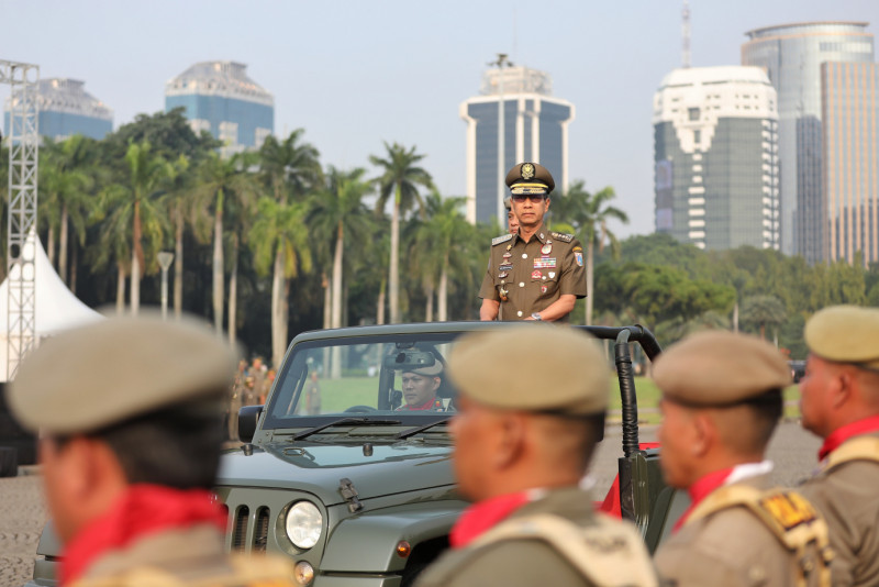 Penjabat (Pj) Gubernur DKI Jakarta, Heru Budi Hartono memimpin upacara peringatan Hari Ulang Tahun (HUT) ke-74 Satuan Polisi Pamong Praja (Satpol PP) dan HUT ke-62 Satuan Tugas Perlindungan Masyarakat (Satlinmas) DKI Jakarta di Lapangan Silang Monas, Gambir, Jakarta Pusat, Jumat (17/5). Dalam kesempatan tersebut, Pj Gubernur mengapresiasi kinerja Satpol PP dan Satlinmas yang menjalankan tugas dengan baik dalam menjaga ketenteraman, ketertiban dan melindungi warga Jakarta.