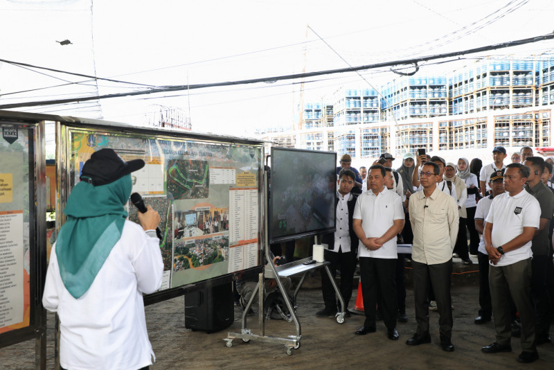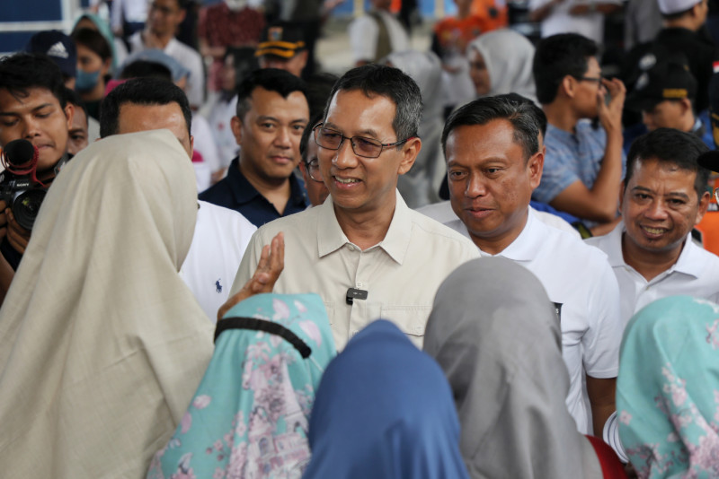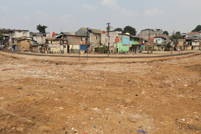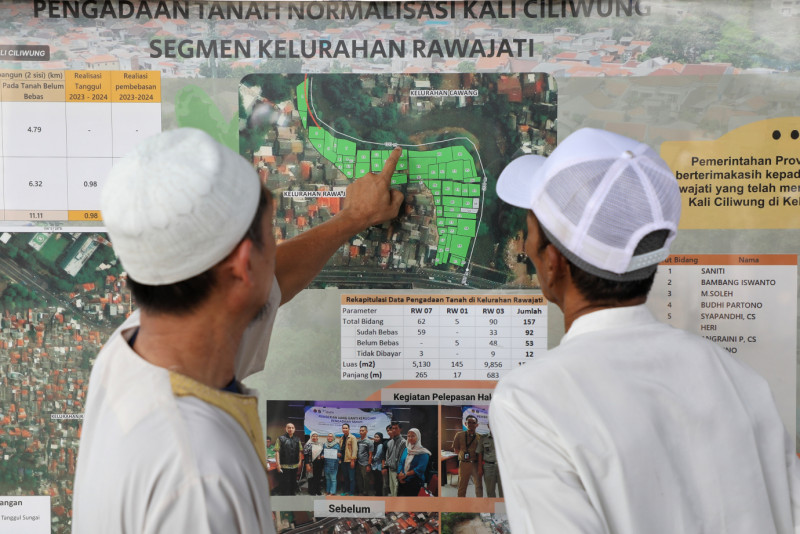 Penjabat (Pj) Gubernur DKI Jakarta, Heru Budi Hartono didampingi Pelaksana Tugas (Plt) Kepala Dinas Sumber Daya Air (SDA) DKI Jakarta, Ika Agustin Ningrum, Wali Kota Jakarta Selatan, Munjirin, beserta tim dari Balai Besar Wilayah Sungai Ciliwung dan Cisadane (BBWSCC) meninjau kawasan lahan yang sudah dibebaskan di Kelurahan Rawajati, Jakarta Selatan, Jumat (17/5). Tinjauan ini untuk memastikan kelancaran proses normalisasi Kali Ciliwung sebagai upaya meminimalisasi potensi banjir saat musim hujan.