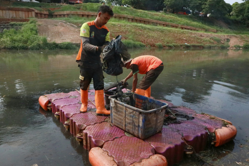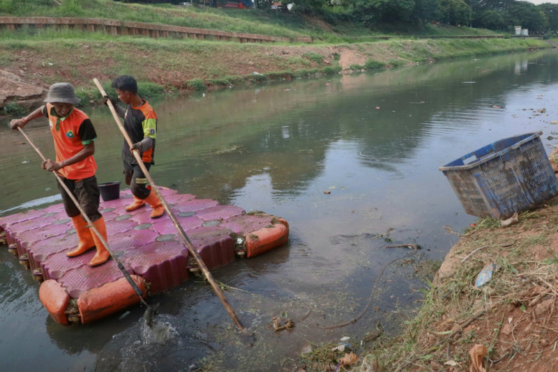 Petugas Unit Penanganan Sampah (UPS) Badan Air Dinas Lingkungan Hidup DKI Jakarta melakukan penyisiran sampah di aliran Kali Kanal Banjir Timur (KBT) Hulu, Jalan Cipinang Besar, Cipinang Besar Selatan, Jatinegara, Jakarta Timur, Jumat (17/5). Dalam satu hari sebanyak enam kubik sampah berhasil diangkat petugas dari aliran KBT Hulu dan memastikan aliran kali tetap bersih.