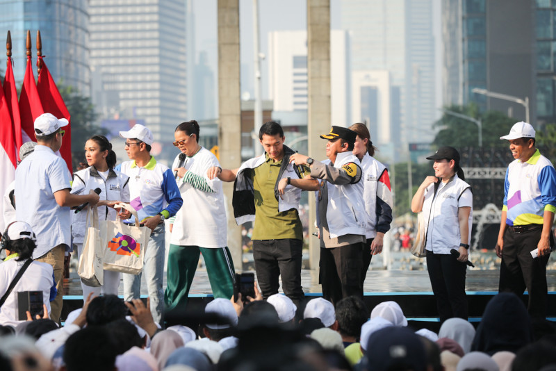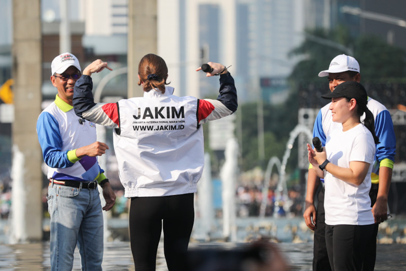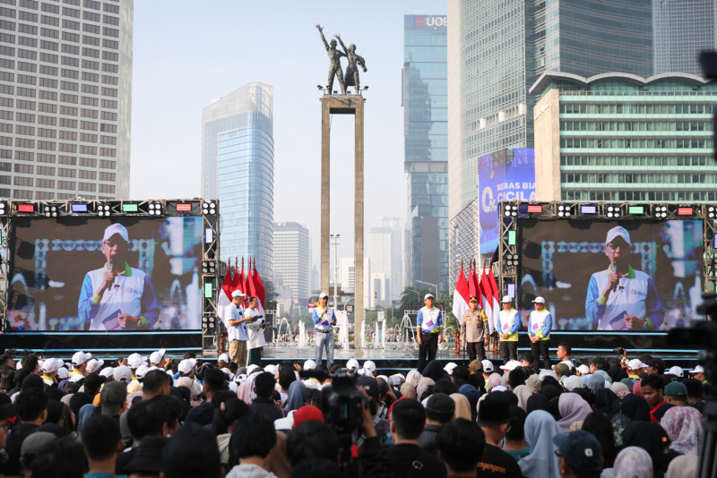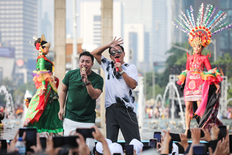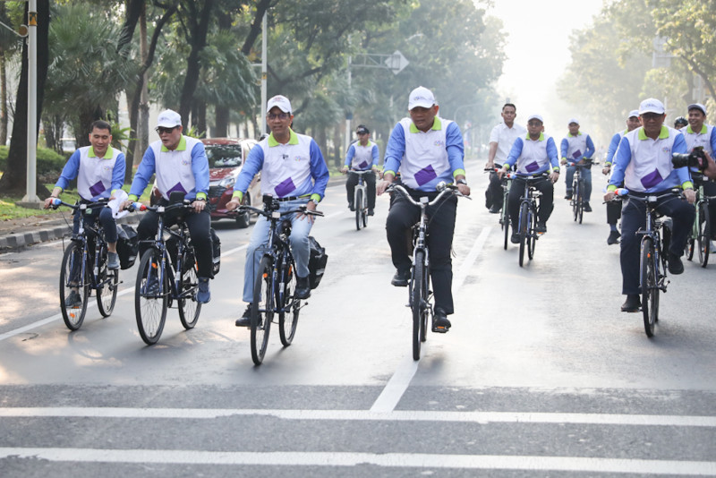 Penjabat (Pj) Gubernur DKI Jakarta, Heru Budi Hartono melakukan Pencanganan Hari Ulang Tahun (HUT) ke-497 Kota Jakarta di Bundaran Hotel Indonesia (HI), Menteng, Jakarta Pusat, Minggu (19/5). Pj Gubernur bersama jajaran Forkopimda bersepeda dari Balai Kota DKI Jakarta menuju Bundaran HI dan menyapa warga di panggung utama.
