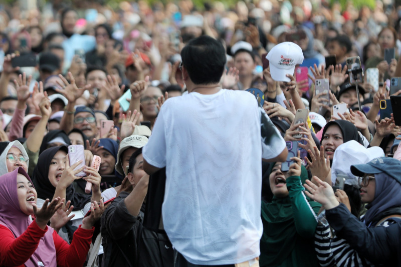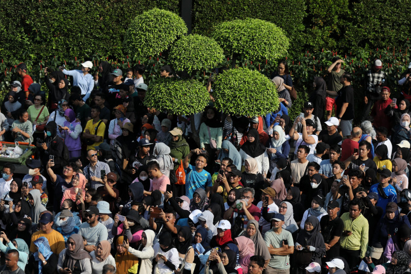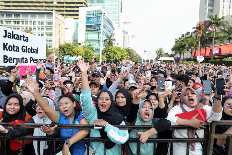 Antusiasme masyarakat saat ikut meramaikan pencanangan Hari Ulang Tahun (HUT) ke-497 Jakarta di Bundaran Hotel Indonesia (HI), Menteng, Jakarta Pusat, Minggu (19/5). Pencanangan yang digelar oleh Pemprov DKI Jakarta ini menjadi awal dari beragam rangkaian kegiatan HUT ke-497 Kota Jakarta.