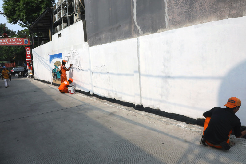 Petugas Penanganan Prasarana dan Sarana Umum (PPSU) membuat mural bernuansa budaya Betawi di Jalan Kartini Raya, RT 01/03, Kartini, Sawah Besar, Jakarta Pusat, Senin (20/5). Pembuatan mural di lokasi merupakan bagian dari program penataan kawasan triwulan ketiga di wilayah Kartini.