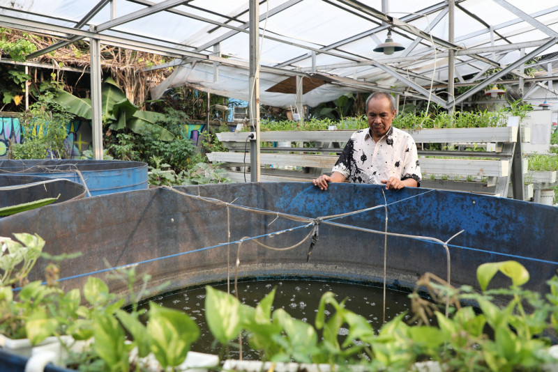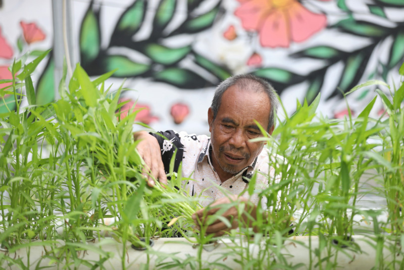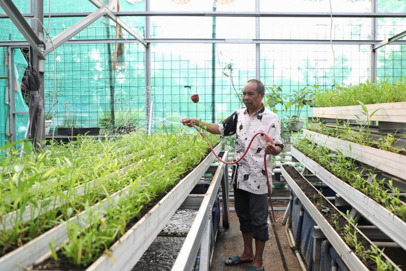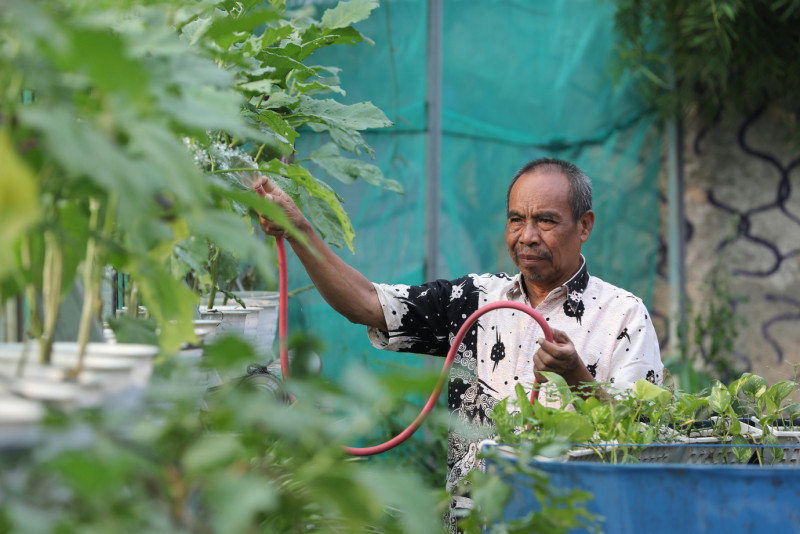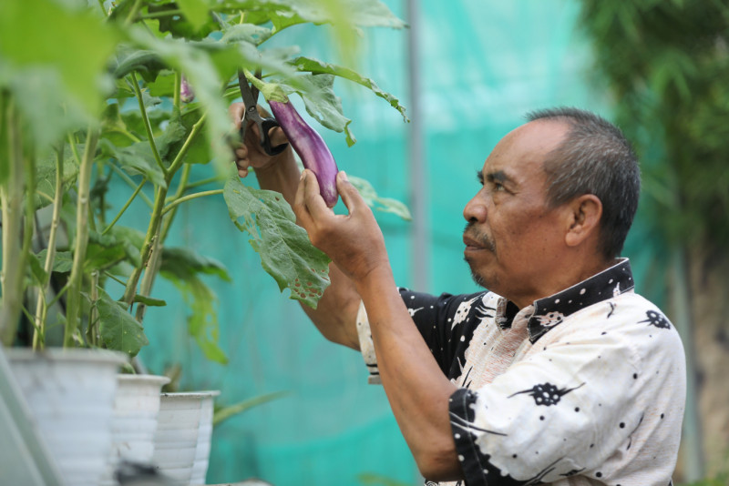 Warga yang tergabung dalam Kelompok Tani (Poktan) Perhimpunan Tani Pancoran (Petapa) melakukan kegiatan pertanian perkotaan (urban farming) di Green House Poktan Petapa, Jalan Pancoran Barat IX, RW 04, Pancoran, Jakarta Selatan, Selasa (21/5). Green House seluas 150 meter persegi tersebut merupakan Kampung Hijau Berbasis Eduwisata.