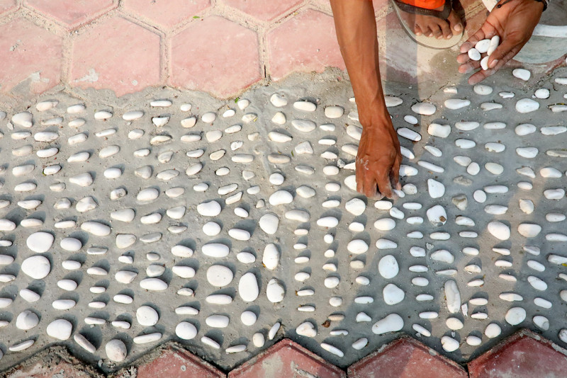 Sejumlah petugas Penanganan Prasarana dan Sarana Umum (PPSU) melakukan pengerjaan penataan kawasan unggulan triwulan kedua di Jalan Tebet Timur Dalam III, Tebet Timur, Tebet, Jakarta Selatan, Selasa (21/5). Dalam penataan kali ini, petugas PPSU menanam berbagai jenis tanaman mulai dari bunga lavender, rosella, cemara air, patah tulang, hingga lili paris.