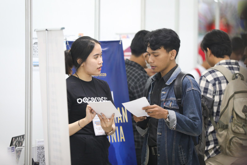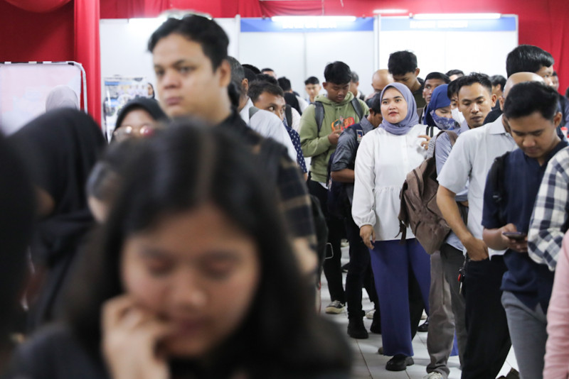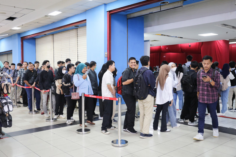 Sejumlah pencari kerja mengunjungi pameran bursa kerja Jakarta Job Fair 2024 di Thamrin City, Tanah Abang, Jakarta Pusat, Selasa (28/5). Suku Dinas Tenaga Kerja, Transmigrasi dan Energi (Sudin Nakertransgi) Jakarta Pusat menggelar Jakarta Job Fair yang diikuti oleh 40 perusahaan selama dua hari pada 28-29 Mei 2024.