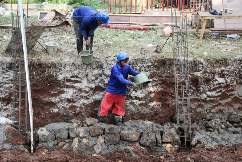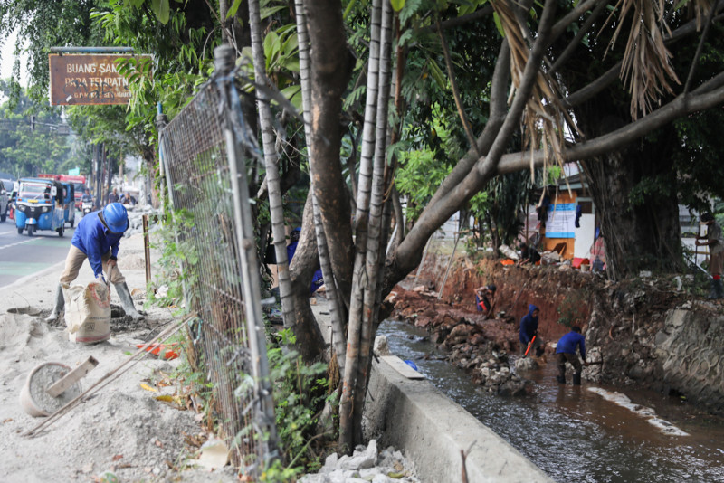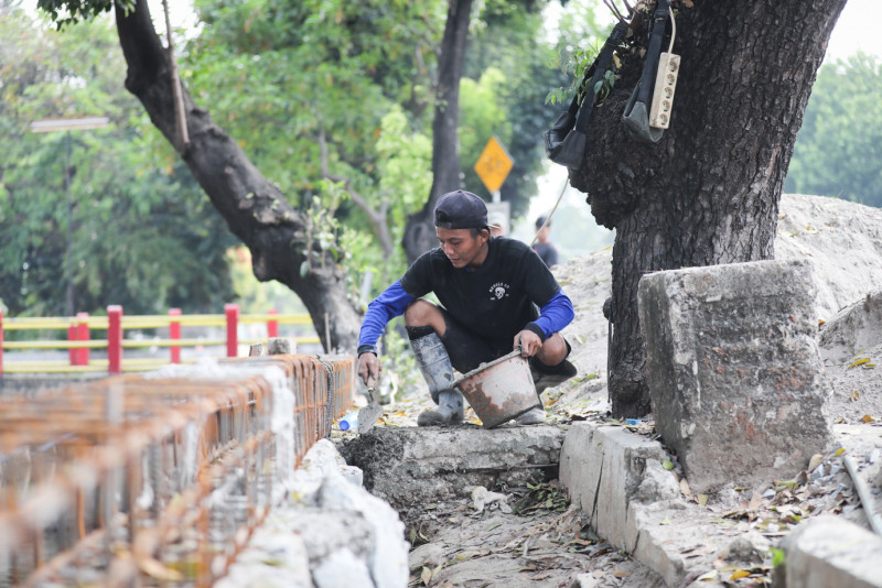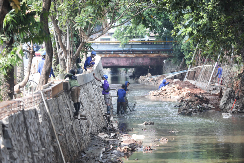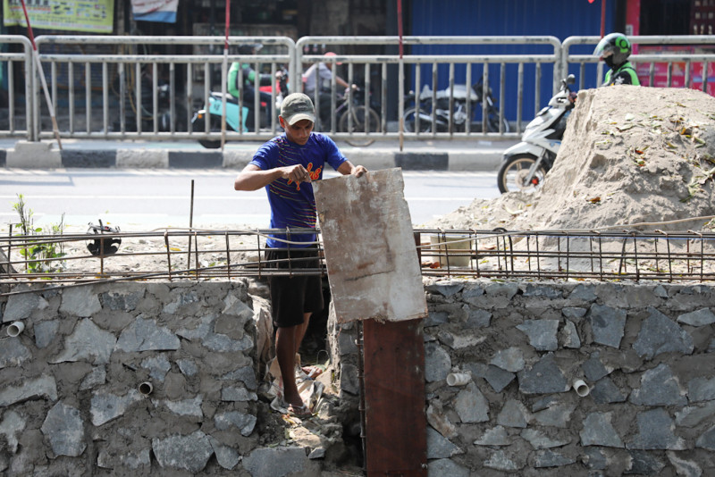 Suku Dinas Sumber Daya Air (Sudin SDA) Jakarta Selatan mengerjakan perbaikan turap di saluran penghubung (phb) Kali Baru Barat, Setiabudi, Jakarta Selatan, Selasa (28/5). Perbaikan turap ini termasuk dalam program pengelolaan dan pengembangan sistem drainase ditargetkan selesai pada akhir Juli 2024.
