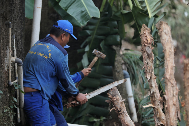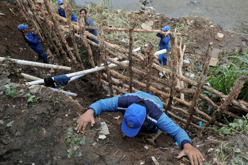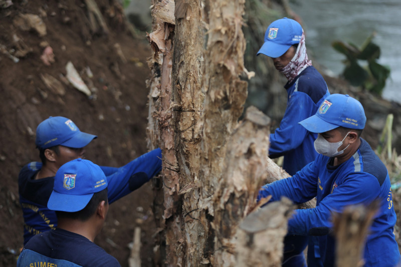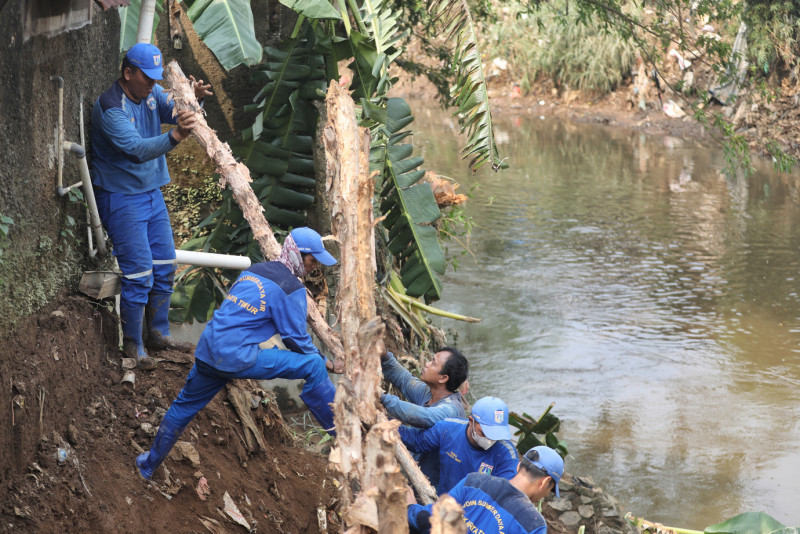 Petugas Suku Dinas Sumber Daya Air Jakarta Timur melakulan penanganan longsor di Bantaran Kali Ciliwung, Gang Amd 28 I, Balekambang, Kramat Jati, Jakarta Timur, Kamis (30/5). Penanganan yang dilakukan berupa pemasangan kayu dolken untuk menghindari longsor lanjutan.
