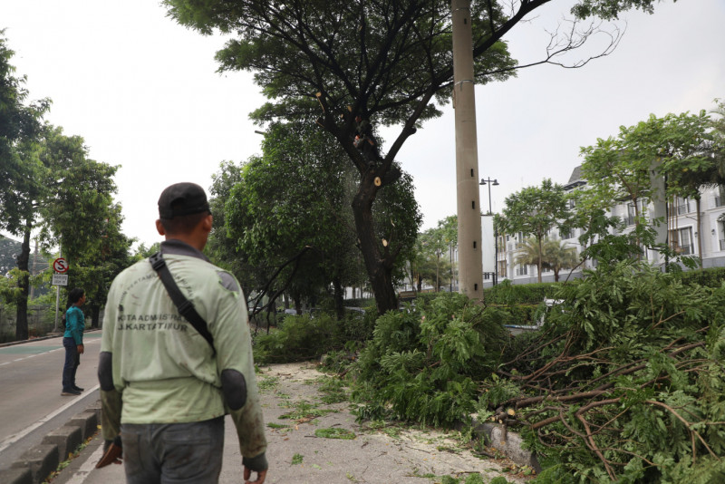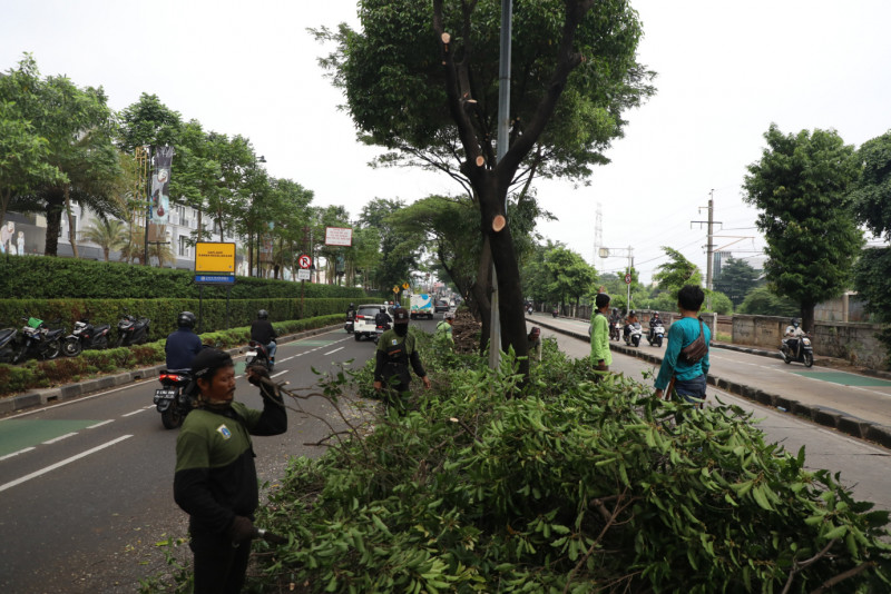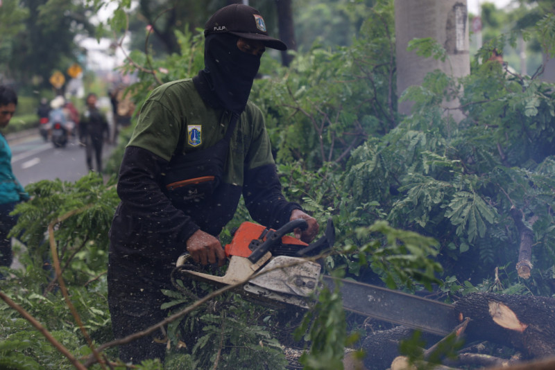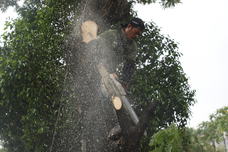 Petugas Suku Dinas Pertamanan dan Hutan Kota(Sudin Tamhut) Jakarta Timur melakukan penopingan pohon di Jalan I Gusti Ngurah Rai, Klender, Duren Sawit, Jakarta Timur, Senin (3/6). Dalam penopingan ini sebanyak enam pohon berhasil toping petugas terdiri dari lima pohon pohon tanjung dan satu pohon trembesi.