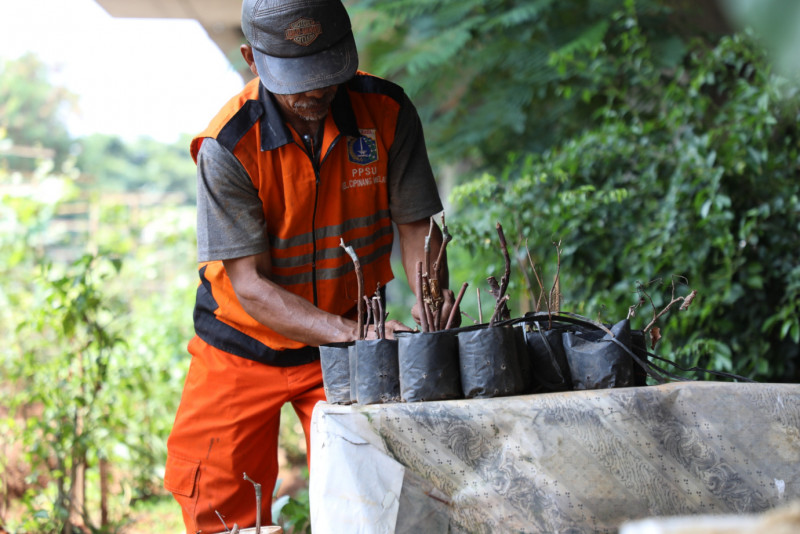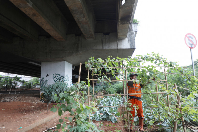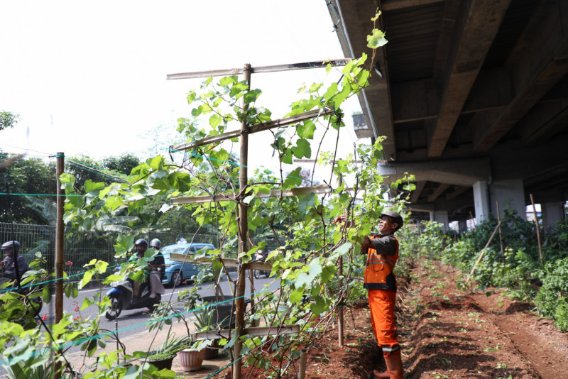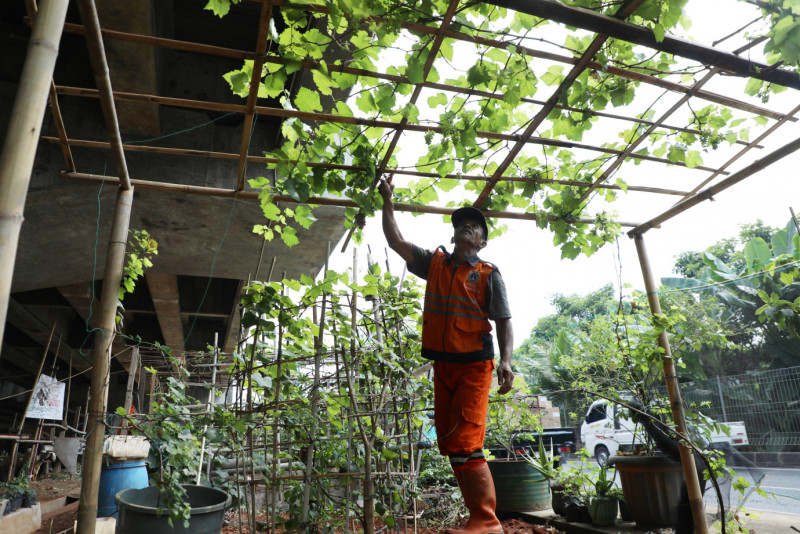 Petugas Penanganan Prasarana dan Sarana Umum (PPSU) Kelurahan Cipinang Melayu memanfaatkan lahan di Kolong Tol Becakayu sebagai sarana budi daya anggur di Jalan Swadaya Raya, Cipinang Melayu, Makasar, Jakarta Timur, Kamis (6/6). Berbagai jenis tanaman anggur seperti jupiter, aroma delight, harold, tamaki, transfiguration hingga gosv ditanam di area ini.