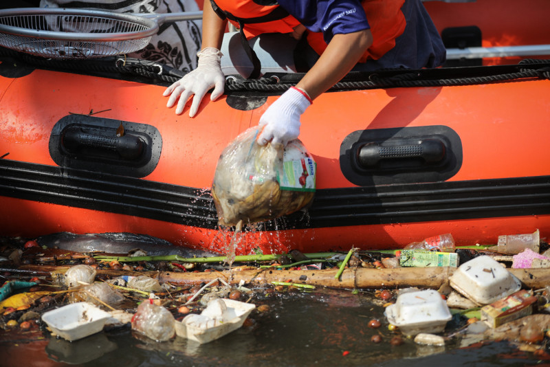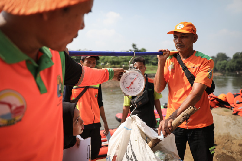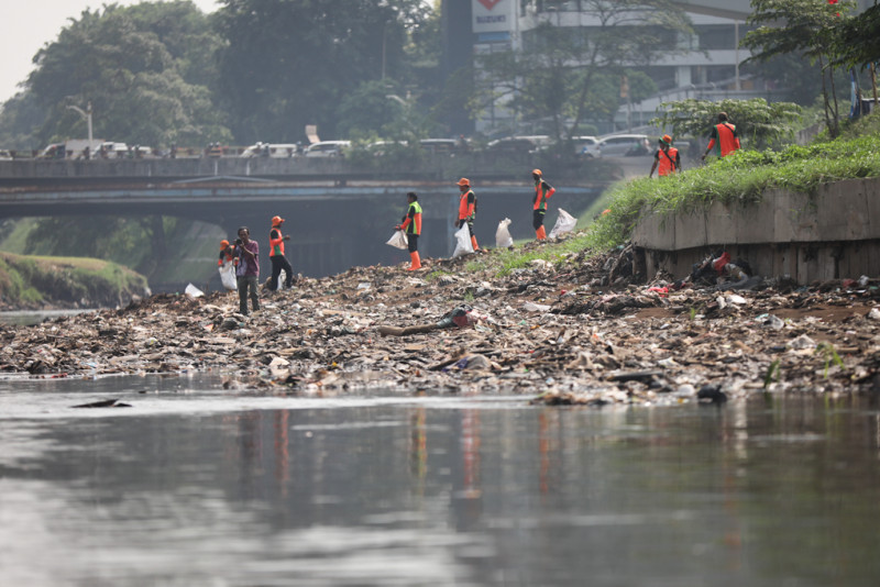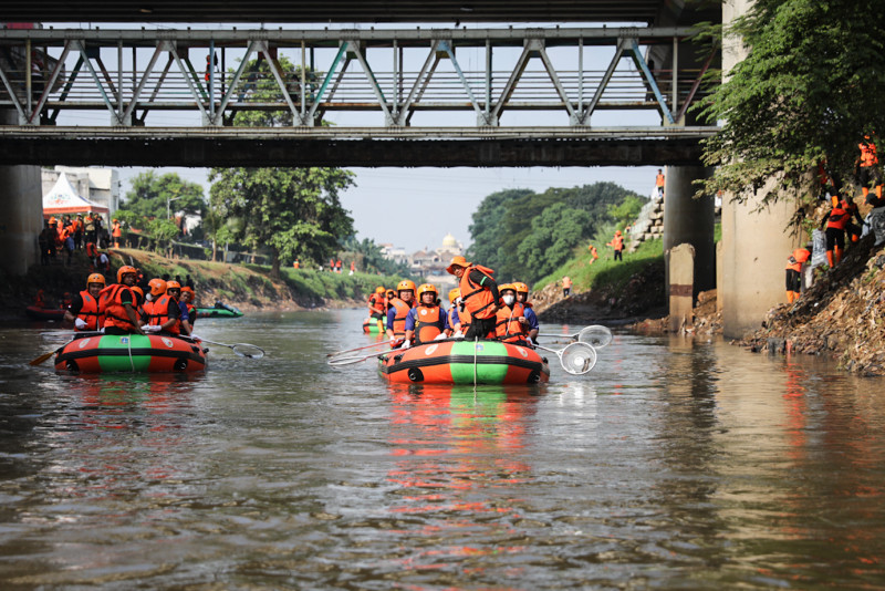 Sejumlah petugas Unit Penanganan Sampah Badan Air (UPS BA) Dinas Lingkungan Hidup DKI Jakarta bersama pegawai Kantor Pelayanan Pajak (KPP) Jakarta Kramat Jati menggelar kegiatan bersih-bersih menyusuri Kali Ciliwung, segmen Jakarta Timur, Jumat (7/6). Kegiatan tersebut digelar dalam rangka Hari Lingkungan Hidup Sedunia yang jatuh pada tanggal 5 Juni.