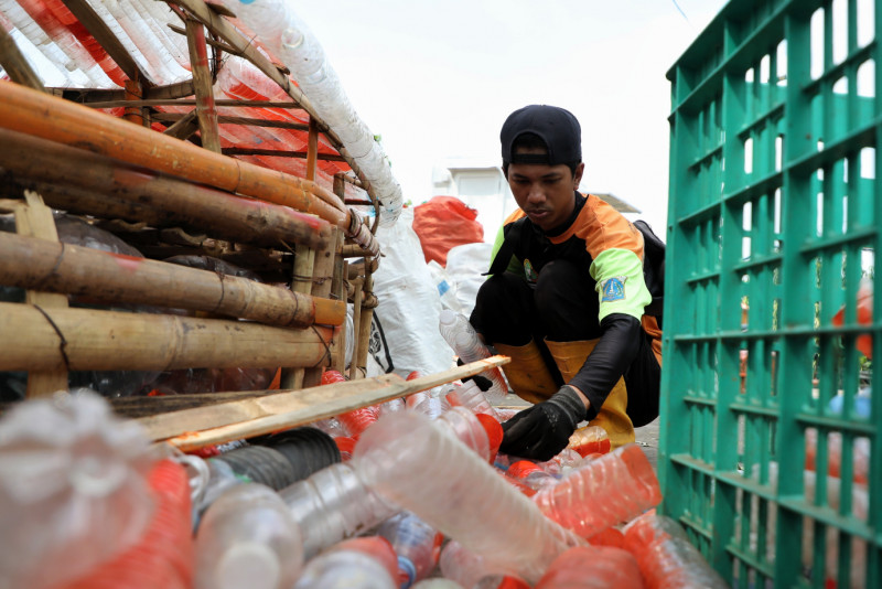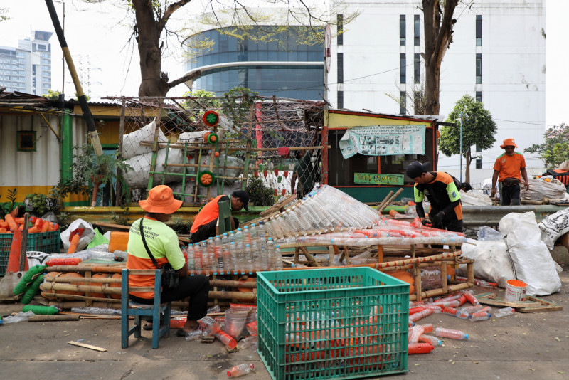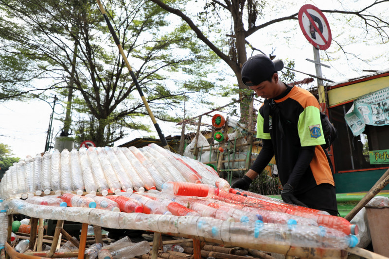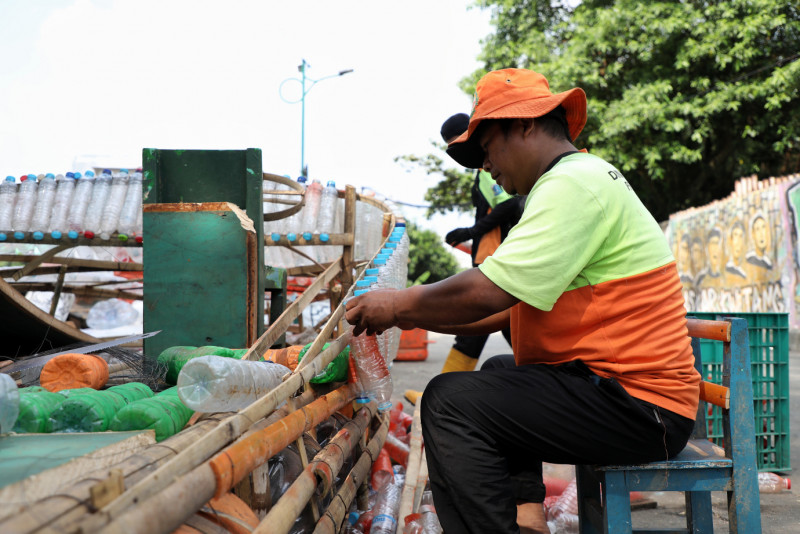 Petugas Unit Penanganan Sampah Badan Air (UPS BA) Dinas Lingkungan Hidup DKI Jakarta Kecamatan Senen menyelesaikan pembuatan perahu dari limbah botol plastik di Jalan Habib Ali Kwitang, Kwitang, Senen, Jakarta Pusat, Jumat (7/5). Perahu ini nantinya akan dikutsertakan pada lomba parade perahu dari limbah botol plastik yang digelar oleh Dinas Lingkungan Hidup DKI Jakarta di Banjir Kanal Timur, Duren Sawit, Jakarta Timur, pada 28 Juni 2024.