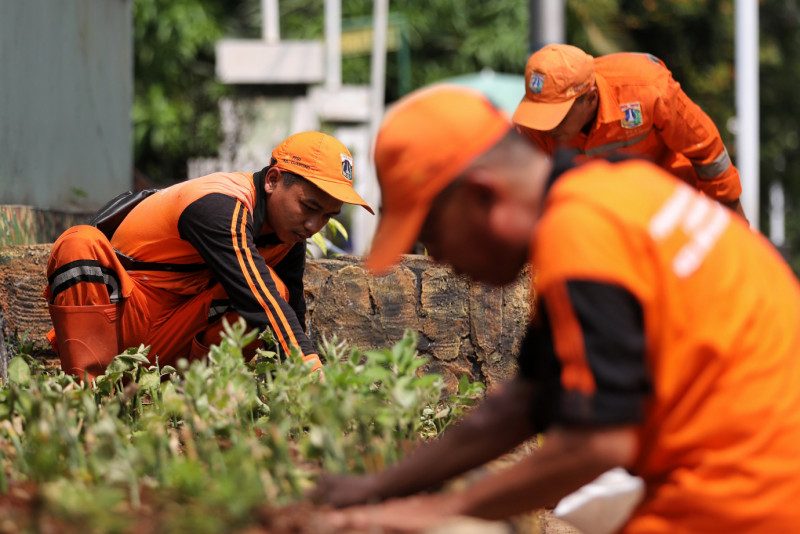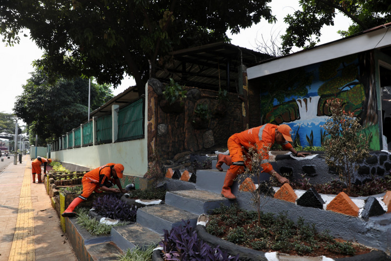 Petugas Penanganan Prasarana dan Sarana Umum (PPSU) Kelurahan Cijantung melakukan penataan kawasan unggulan triwulan dua di Jalan RA Fadillah RT.04 RW.04, Pasar Rebo, Jakarta Timur, Senin (10/6). Kawasan unggulan yang memiliki konsep taman batu alam ini bisa dikatakan sudah rampung sejak kemarin, tinggal menyelesaikan hal-hal kecil agar lebih detail.
