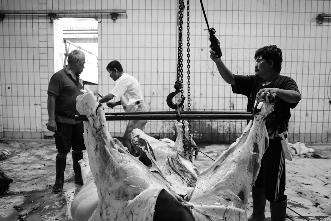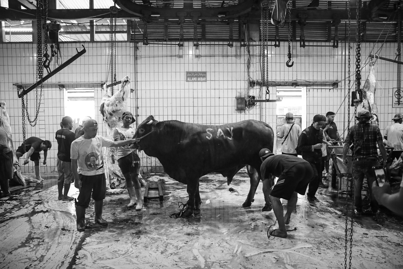 Petugas juru sembelih hewan halal (juleha) menyembelih puluhan ekor sapi kurban di Rumah Pemotongan Hewan (RPH) Perumda Dharma Jaya, Cakung, Jakarta Timur, Senin (17/6). Sebanyak 100 juleha serta petugas pengemasan dan distribusi dipekerjakan di RPH Dharma Jaya yang mampu memotong 200-250 ekor sapi per hari saat Iduladha 1445 Hijriah. #iduladha2024