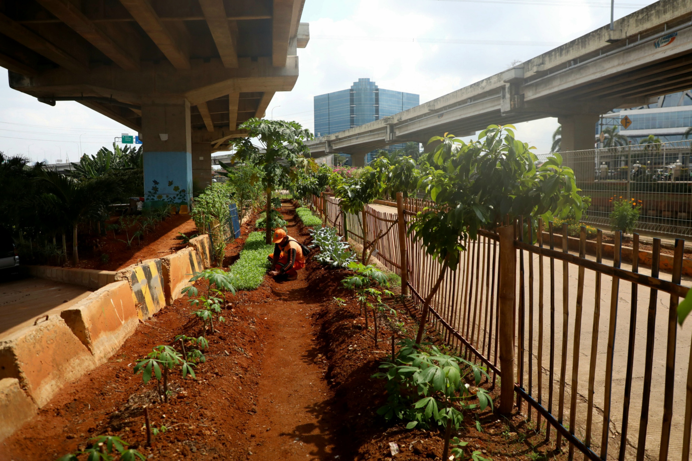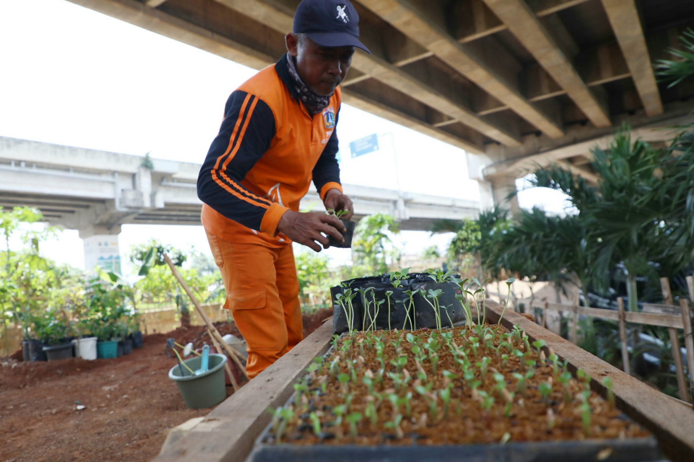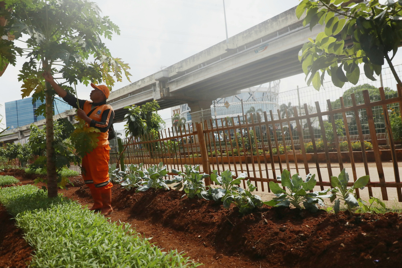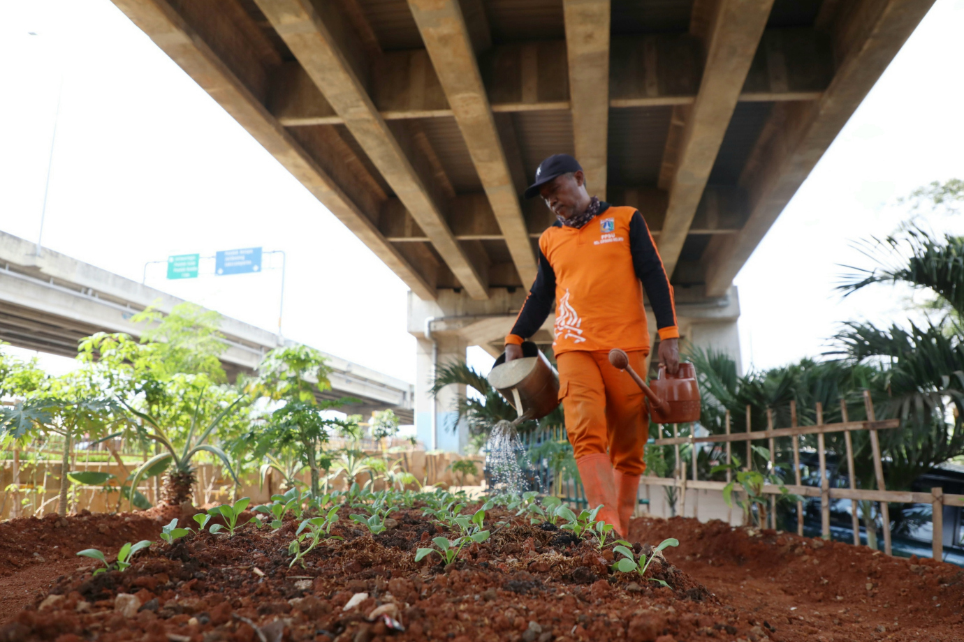 Petugas Penanganan Prasarana dan Sarana Umum (PPSU) Kelurahan Cipinang Melayu mengubah lahan kolong Tol Becak Kayu menjadi Kawasan Urban Farming di RW 04 Jalan Inspeksi Kali Tarum Barat, Cipinang Melayu, Makasar, Jakarta Timur, Kamis (27/6). Lahan seluas 750 meter persegi ini ditanami beragam jenis sayuran mulai dari sawi, kembang kol, kangkung, pakcoy hingga bayam.