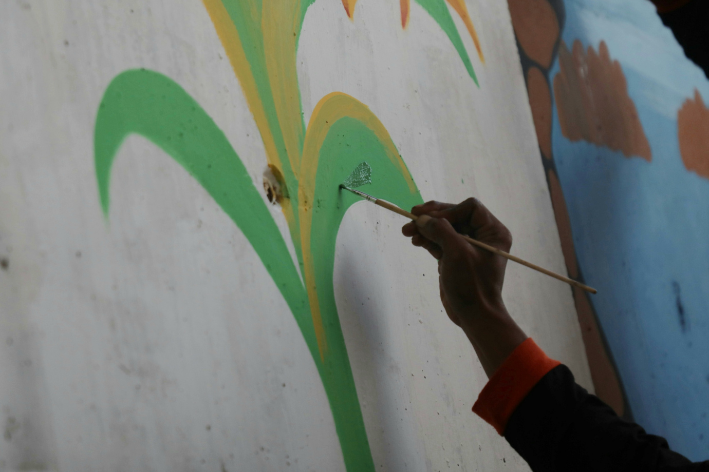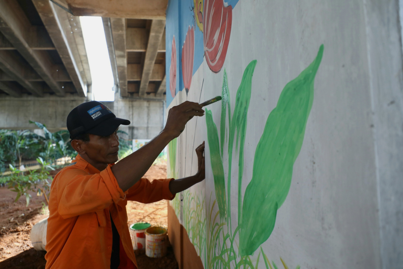 Petugas Penanganan Prasarana dan Sarana Umum Kelurahan Cipinang Muara membuat mural di Kolong Tol Becakayu, Jalan Laksamana Malahayati, Cipinang Muara, Jatinegara, Jakarta Timur, Sabtu (29/6). Pembuatan Mural ini merupakan bagian dari penataan kawasan unggulan Triwulan ke III Tahun 2024 di Kelurahan Cipinang Muara.