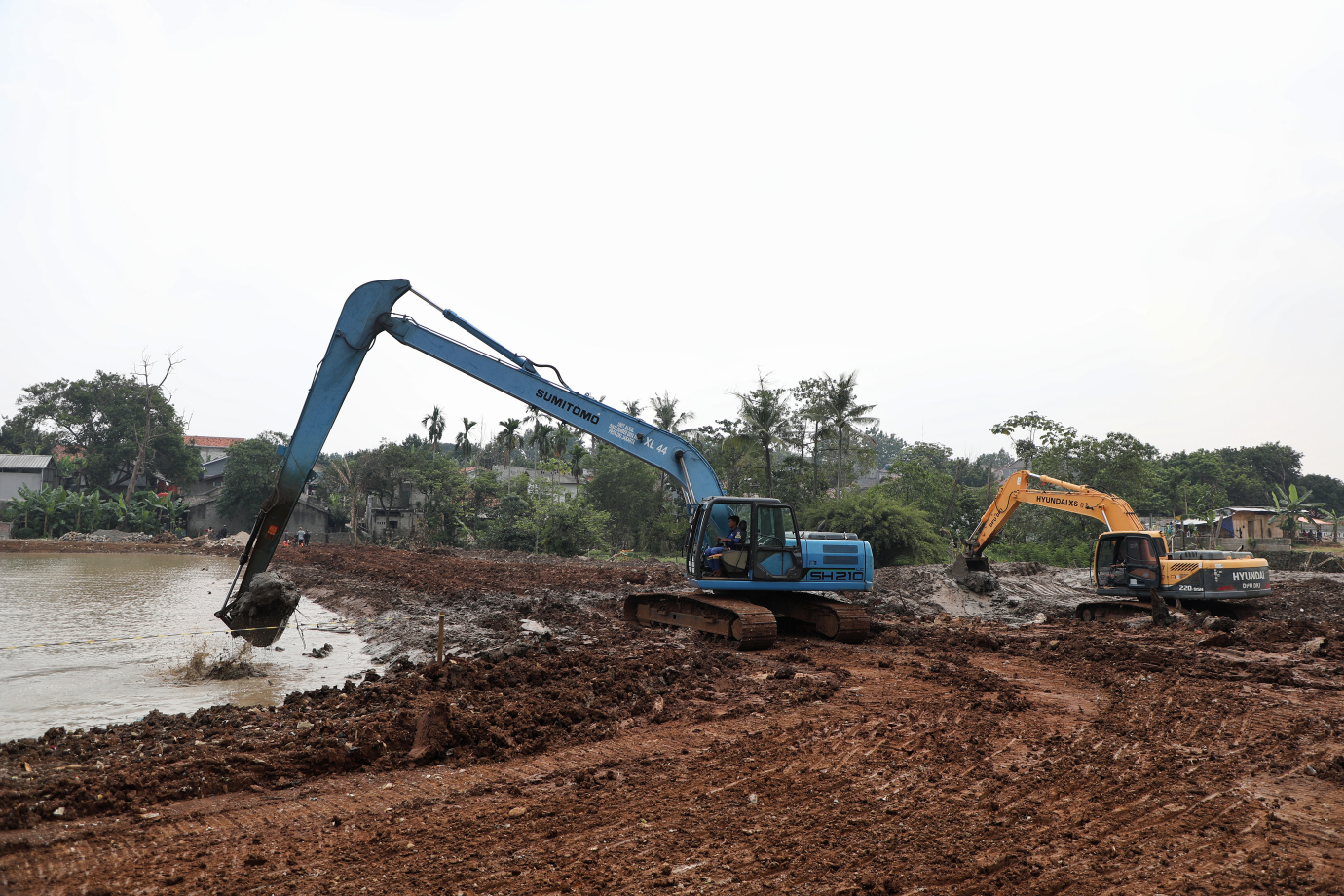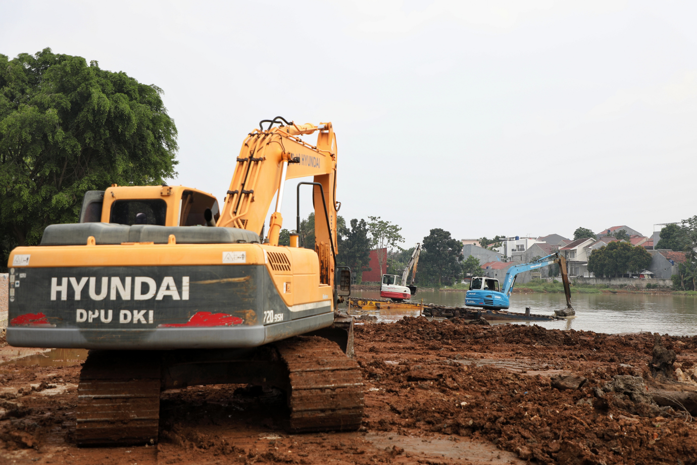 Suku Dinas Sumber Daya Air (Sudin SDA) Jakarta Selatan mengerjakan pembangunan Embung Pemuda di Jalan Pemuda 1, Srengseng Sawah, Jagakarsa, Jakarta Selatan, Senin (1/7). Waduk ini memiliki total luas area 22.017 meter persegi yang akan dilengkapi berbagai fasilitas penunjang bagi masyarakat, seperti jogging track hingga tempat parkir kendaraan.