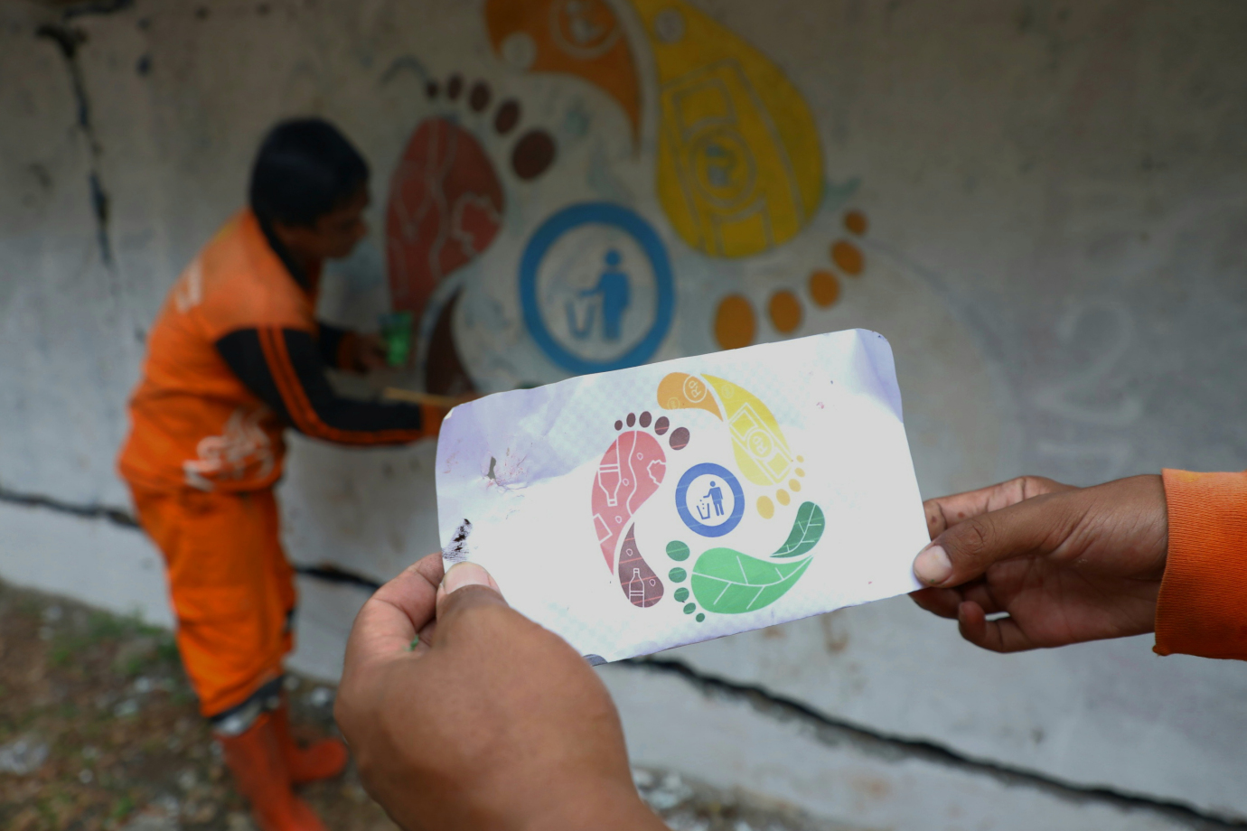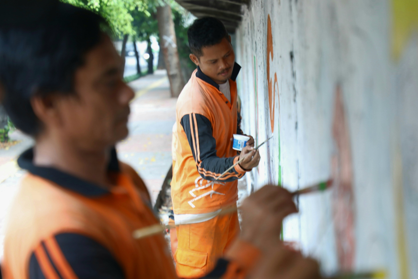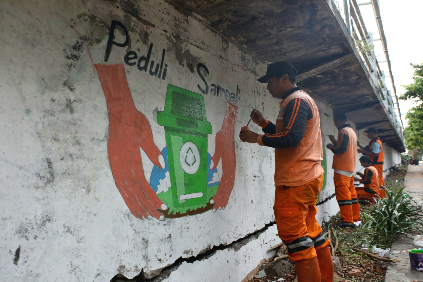Lima petugas Penanganan Prasarana dan Sarana Umum (PPSU) Kelurahan Malaka S ari mempercantik kawasan Jalan I Gusti Ngurah dengan Mural, Selasa (2/7). Pembuatan mural dengan tema \"Peduli Sampah\" yang dimulai dari 27 Juni hingga 3 Juli 2024 ini bertujuan untuk mempercantik kawasan Kelurahan Malaka Sari.