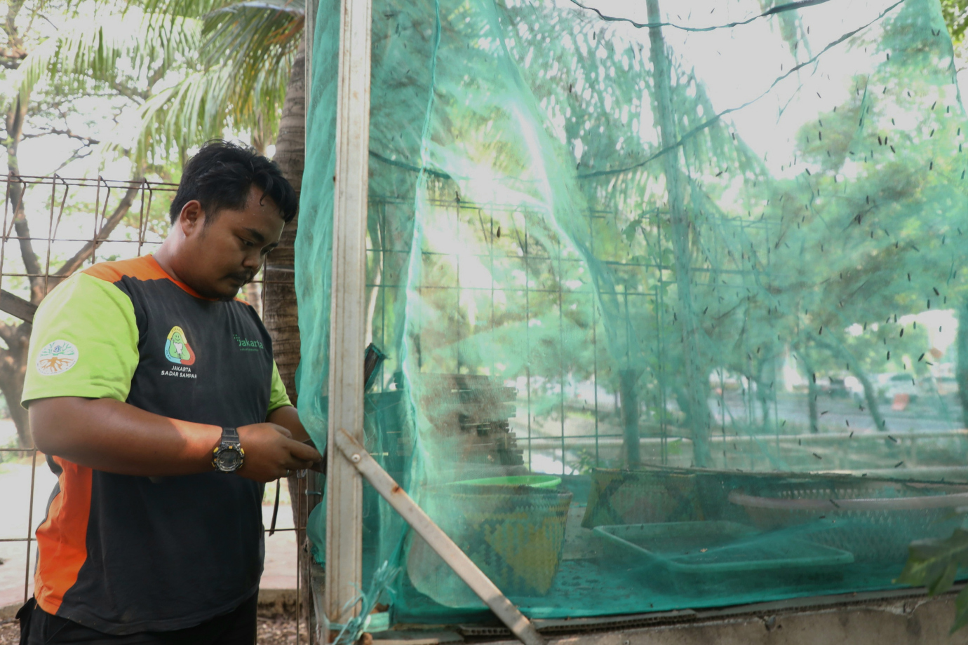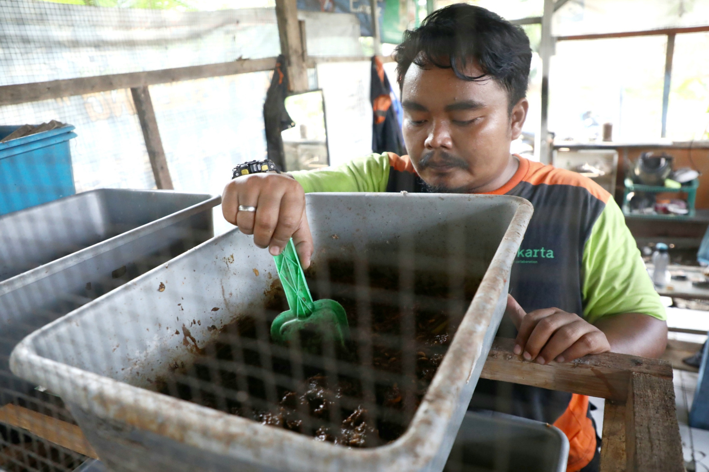 Petugas Unit Penanganan Sampah Badan Air (UPS BA) Dinas Lingkungan Hidup Kecamatan Kelapa Gading membudidayakan maggot Black Soldier Fly (BSF) di pos unit UPS BA Kelapa Gading, Jalan inspeksi Kali Sunter, Kelapa Gading Barat, Jakarta Utara, Rabu (3/7). Dengan melakukan budi daya maggot petugas UPS BA Kelapa Gading dapat mengurai sampai organik hingga 360 kilogram sampah dalam satu bulan.