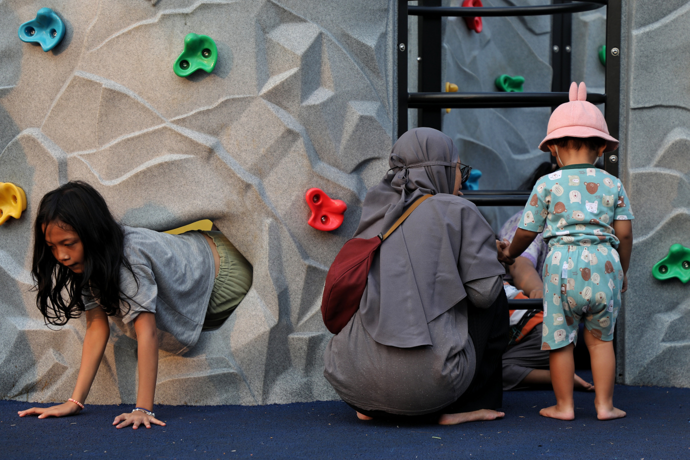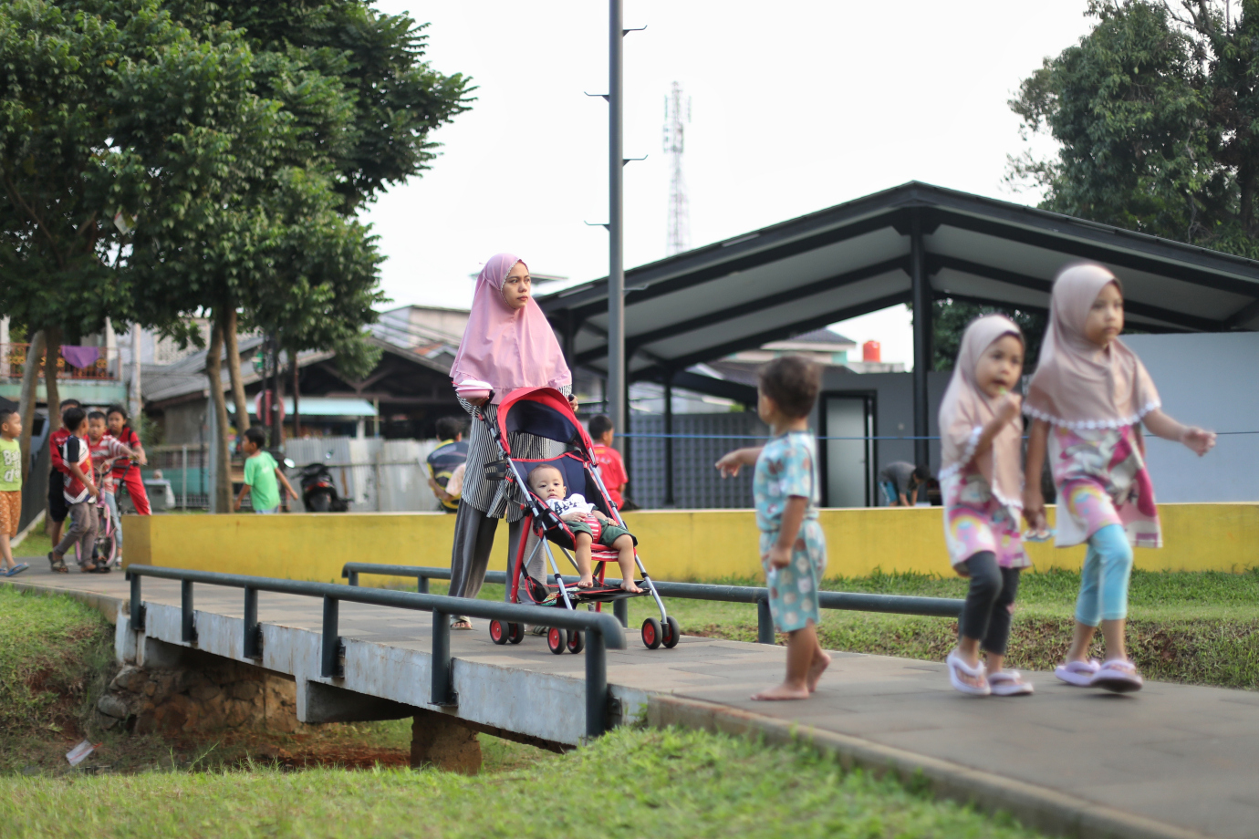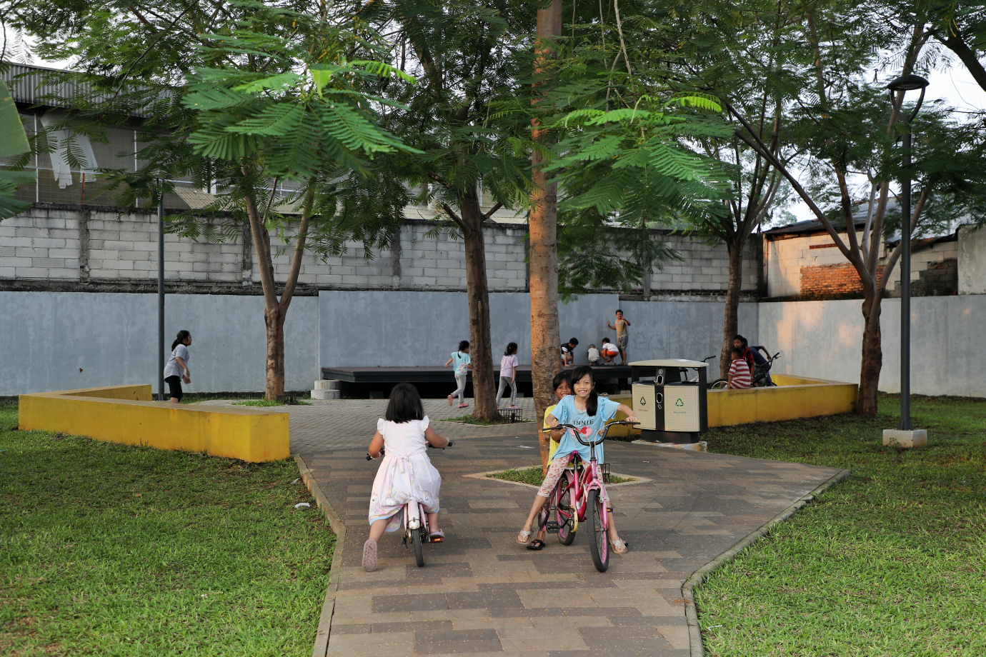 Sejumlah warga menikmati waktu sore di Texas Eco Park, Jalan Centex, Ciracas, Jakarta Timur. Taman baru dengan luas 2.446 meter persegi ini dilengkapi dengan fasilitas seperti Jogging track, lapangan multifungsi, area duduk dan arena bermain anak.
