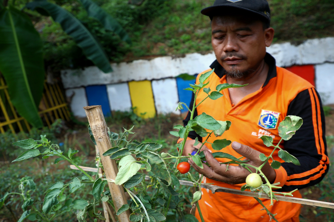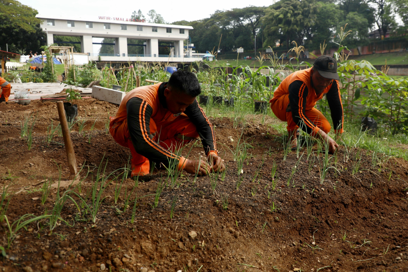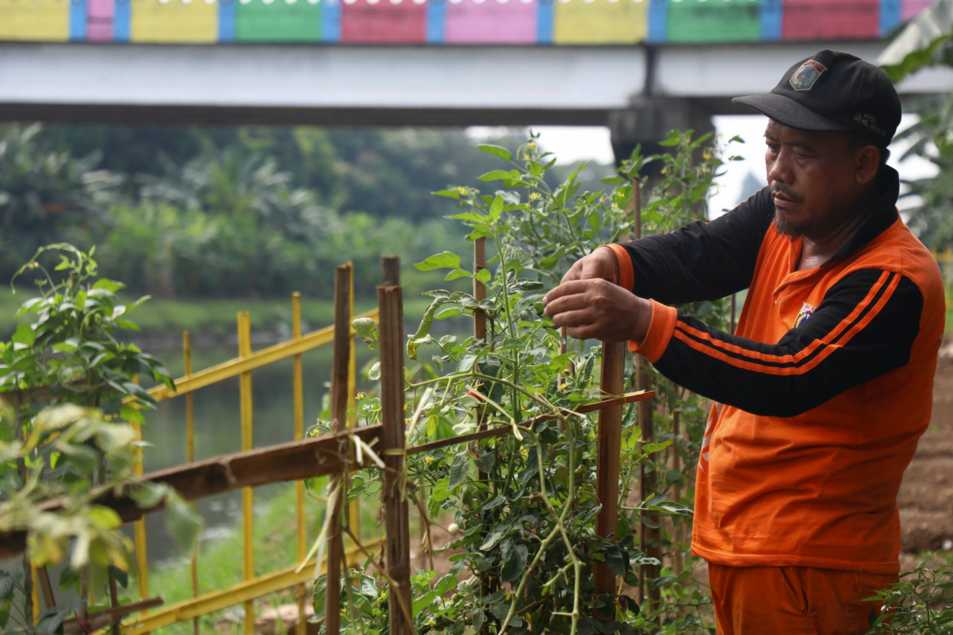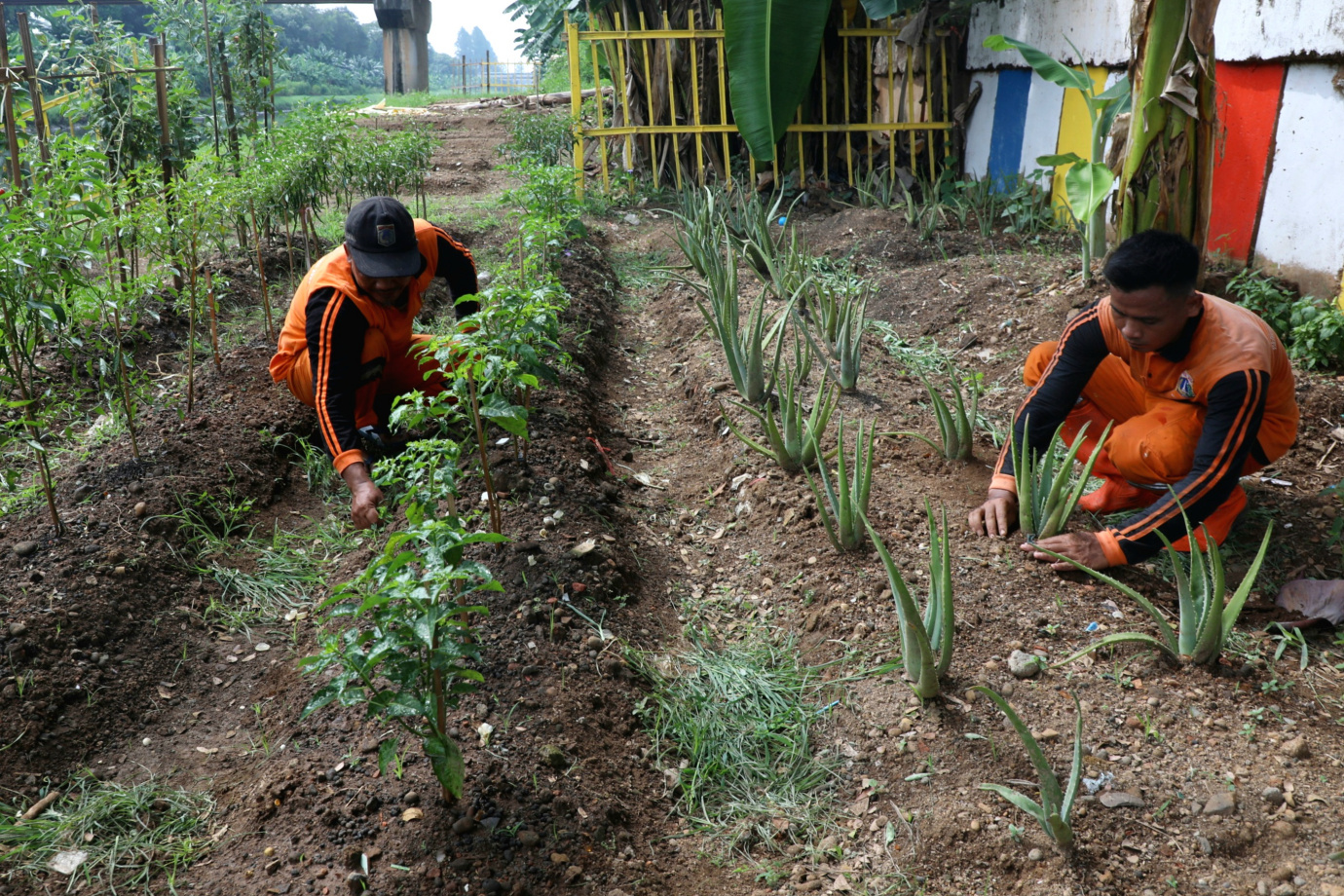 Petugas Penanganan Prasarana dan Sarana Umum (PPSU) Kelurahan Malaka Sari memanfaatkan lahan di area pintu air kanal banjir timur (KBT) menjadi Urban Farming, Kamis (4/7). Area Urban Farming ini memiliki lahan seluas 400 meter persegi ditanam berbagai macam jenis sayuran mulai dari cabai, bawang, terung, tomat hingga lidah buaya.