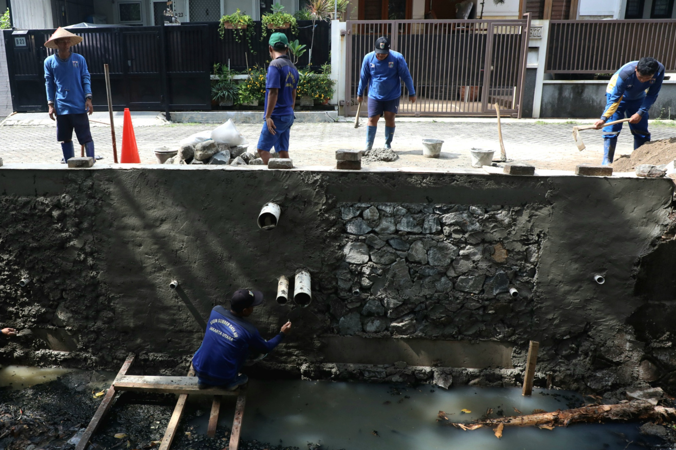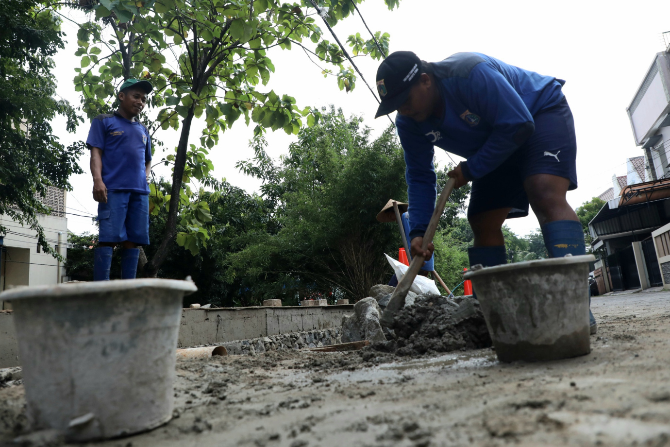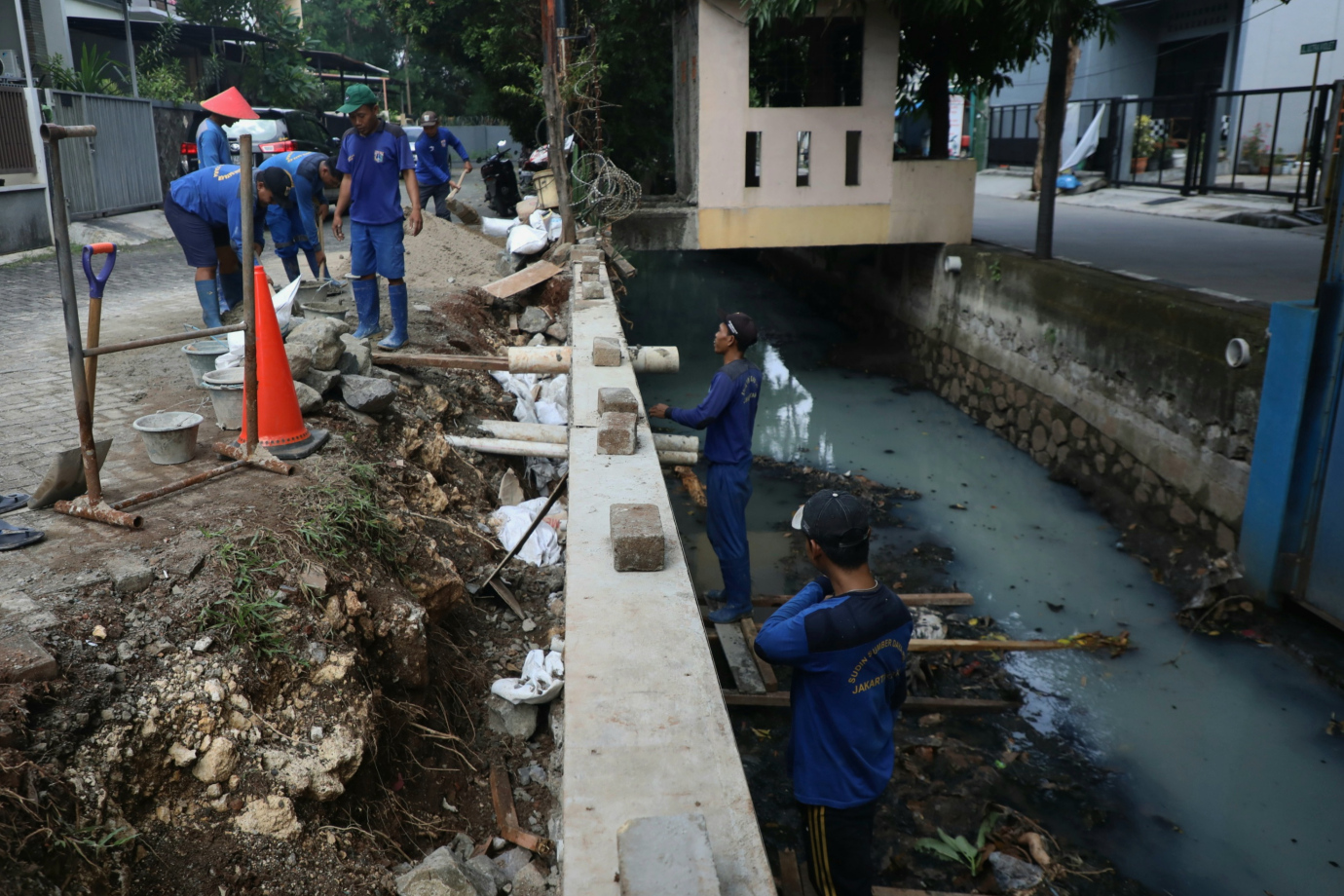 Tujuh Petugas Satuan Pelaksana Sumber Daya Air (Satpel SDA) Kecamatan Kelapa Gading melakukan perbaikan turap saluran penghubung (Phb) Biru Laut di Jalan Biru Laut Timur, Jakarta Utara, Jumat (5/7). Perbaikan turap sepanjang 22 meter dan tinggi 180 sentimeter rusak karena terdorong akar tanaman.