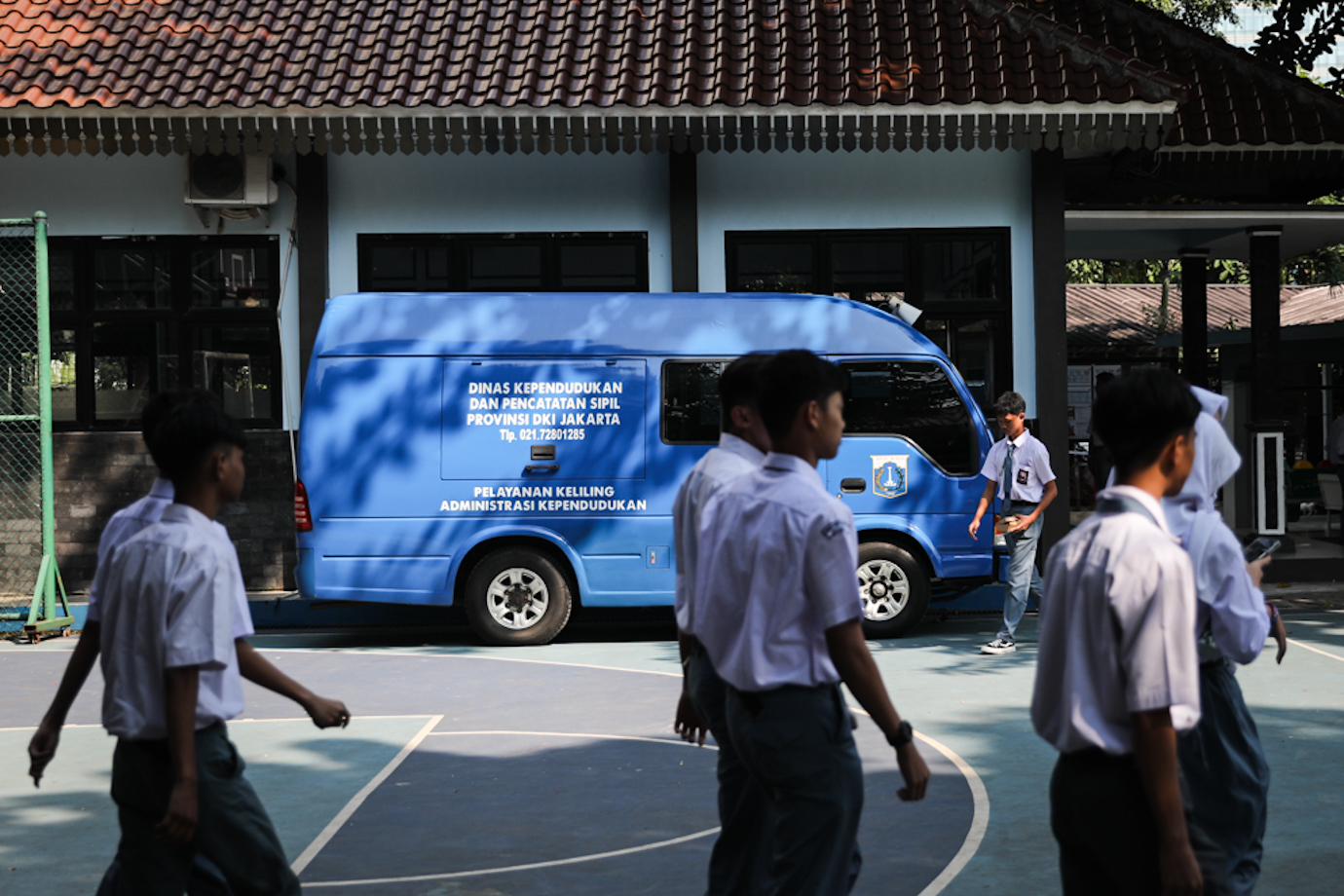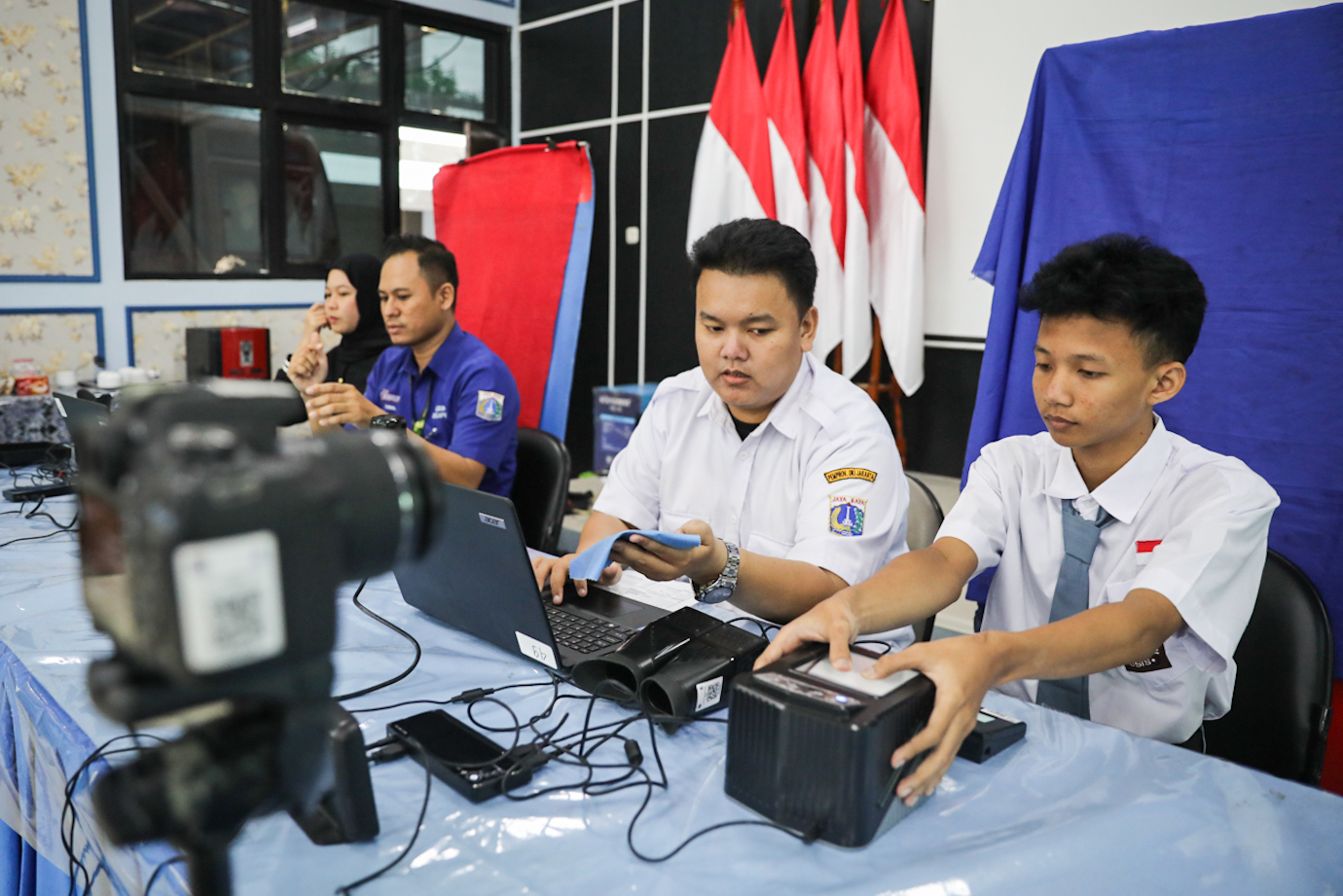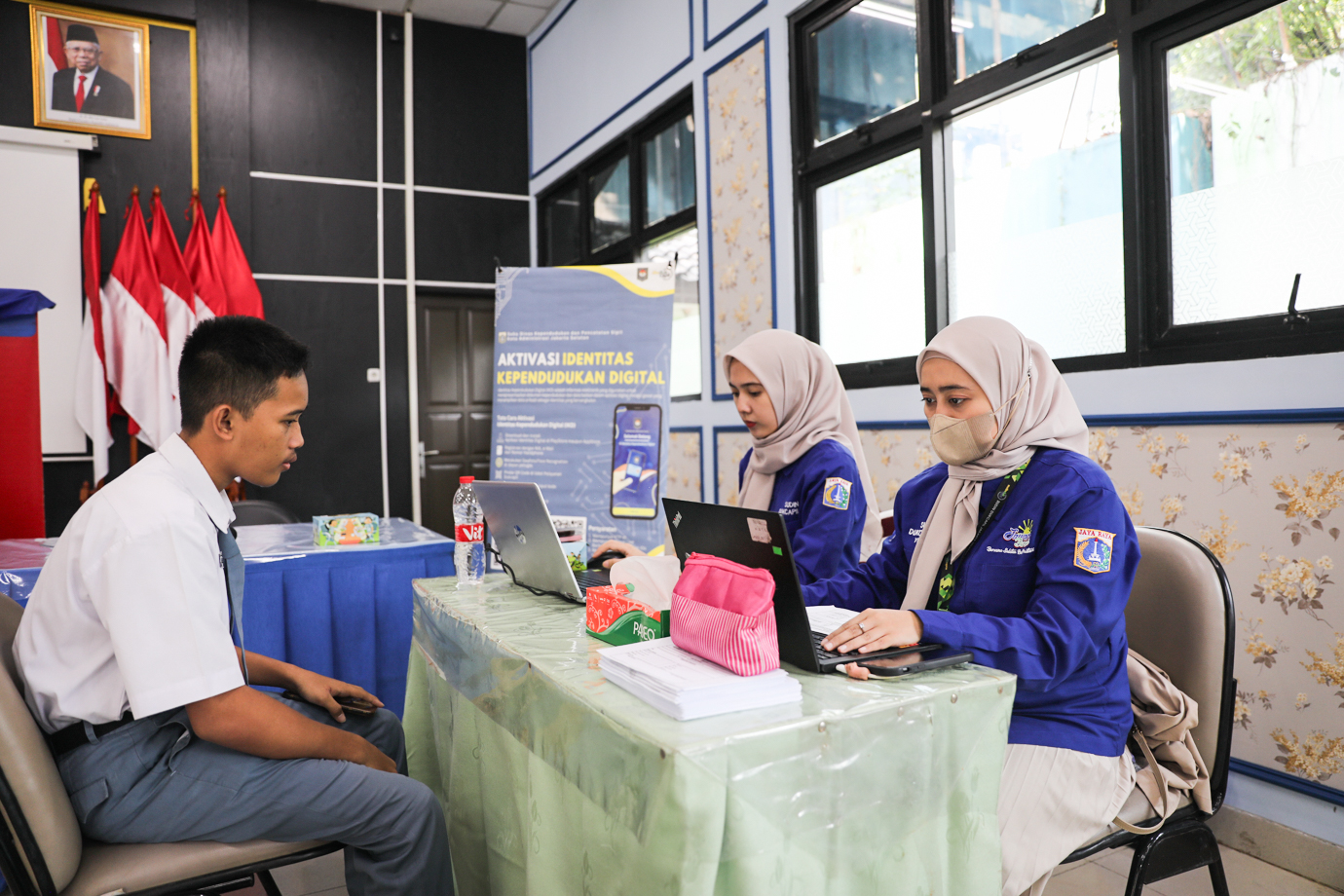 Sejumlah pelajar melakukan perekaman KTP elektronik (KTP-el) dan aktivasi Identitas Kependudukan Digital (IKD) di SMAN 3 Jakarta, Setiabudi, Jakarta Selatan, Selasa (16/7). Suku Dinas Kependudukan dan Catatan Sipil (Sudin Dukcapil) Jakarta Selatan menggelar layanan jemput bola perekaman KTP-el dan aktivasi IKD ke sejumlah sekolah untuk mempermudah siswa dalam rangka tertib administrasi kependudukan.