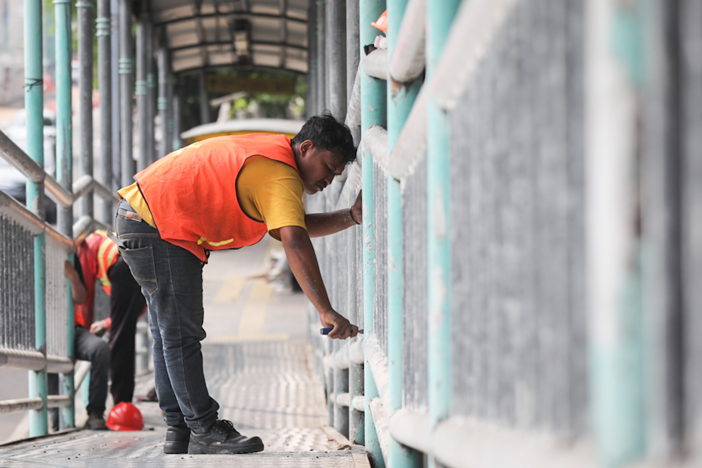 Pekerja mengerjakan perawatan jembatan penyeberangan orang (JPO) Rawamangun, di Jalan Pemuda, Pulogadung, Jakarta Timur, Rabu (24/7). Pengerjaan ini merupakan pemeliharaan rutin prasarana dan sarana utilitas kota oleh Dinas Bina Marga DKI Jakarta yang termasuk dalam Program Penyelenggaraan Jalan tahun 2024.