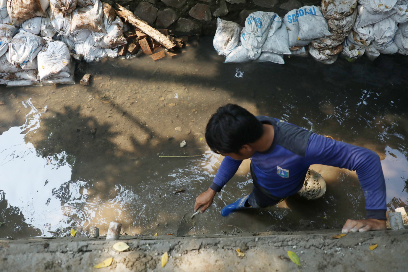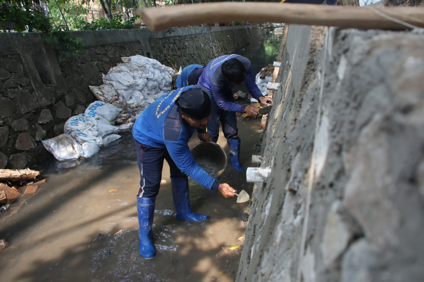 Delapan petugas Satuan Pelaksana Dinas Sumber Daya Air (Satpel SDA) Kecamatan Kelapa Gading melakukan perbaikan turap di Jalan Tabanas, Pegangsaan Dua, Jakarta Utara, Rabu (24/7). Perbaikan turap sepanjang 7, 55 meter dengan lebar 40 sentimeter ini dimulai dari 18 Juli dan ditargetkan rampung pada 29 Juli 2024.