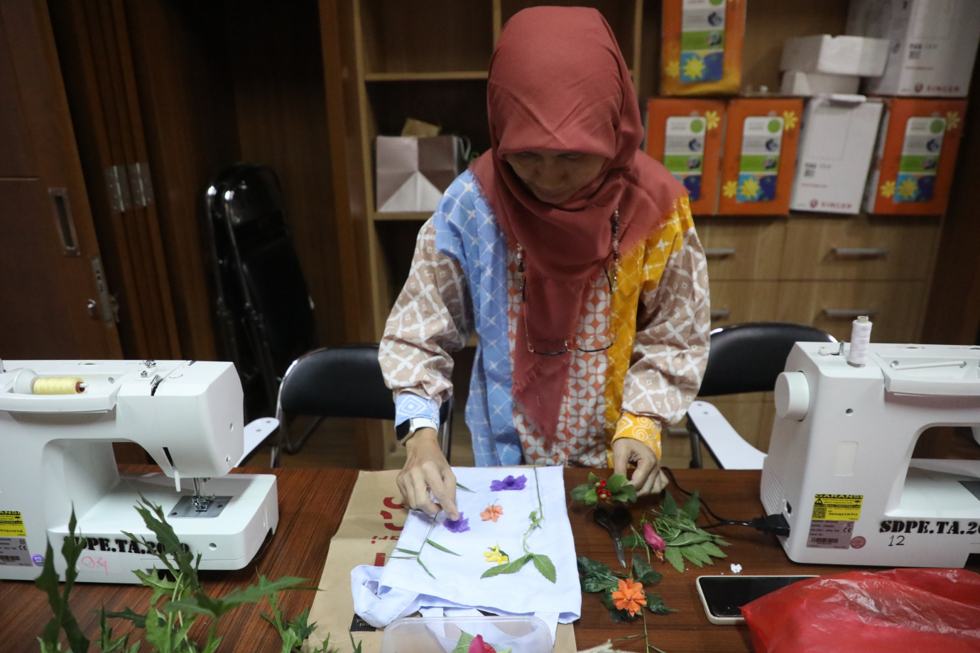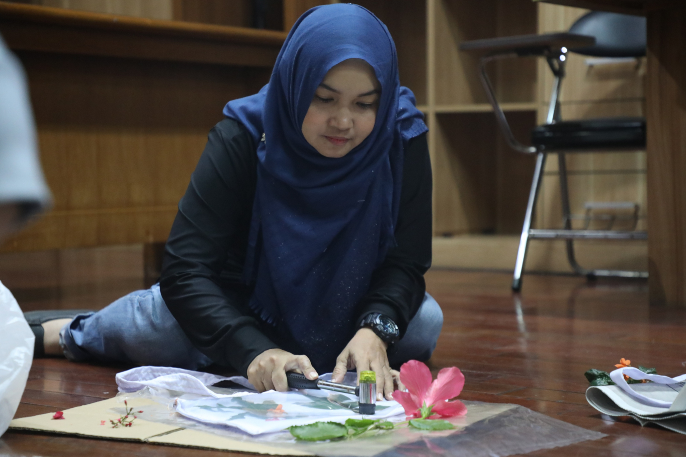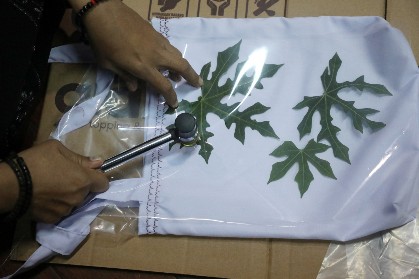 Suku Dinas Perindustrian, Perdagangan, Koperasi dan Usaha Kecil dan Menengah (Sudin PPUPKM) Jakarta Timur melalui Tempat Kumpul Kreatif (TKK) menggelar Workshop Ecoponding on Totebag di TKK Jatinegara Kaum, Kamis (25/7). Sebanyak 10 peserta mengikuti pelatihan ini dan peserta diajarkan teknik percetakan yang menggunakan bahan-bahan organik berupa daun, bunga dan batang tanaman untuk membuat pola pada kain yang disebut dengan teknik Ecoprint.