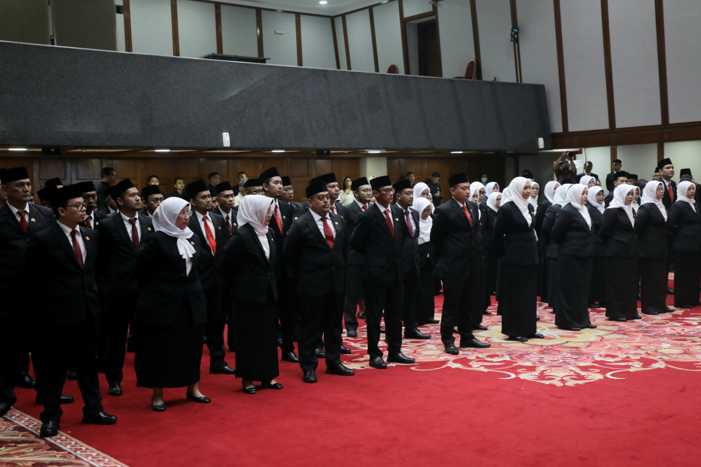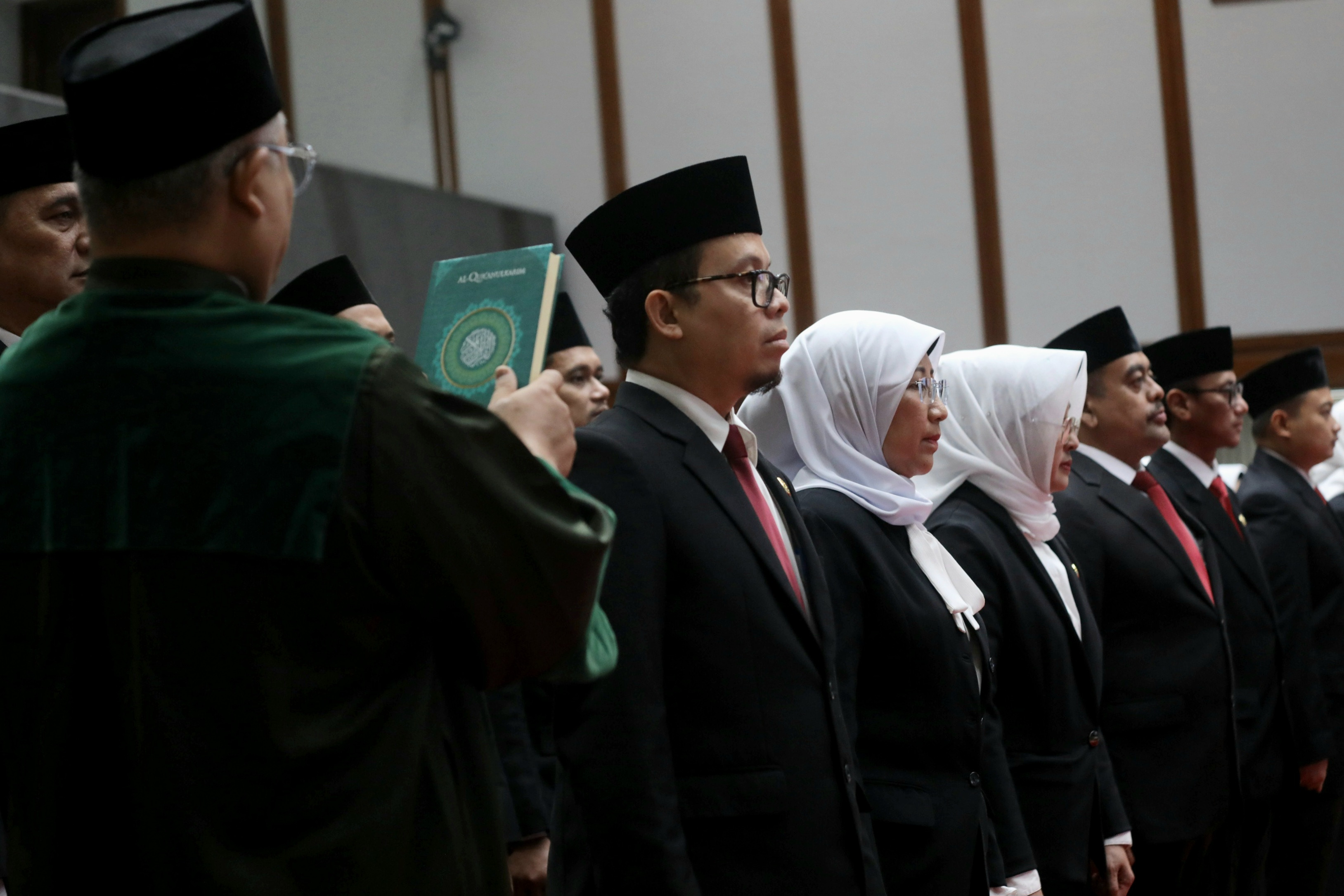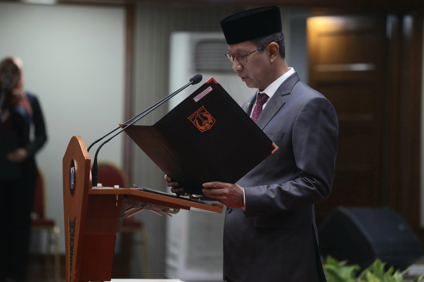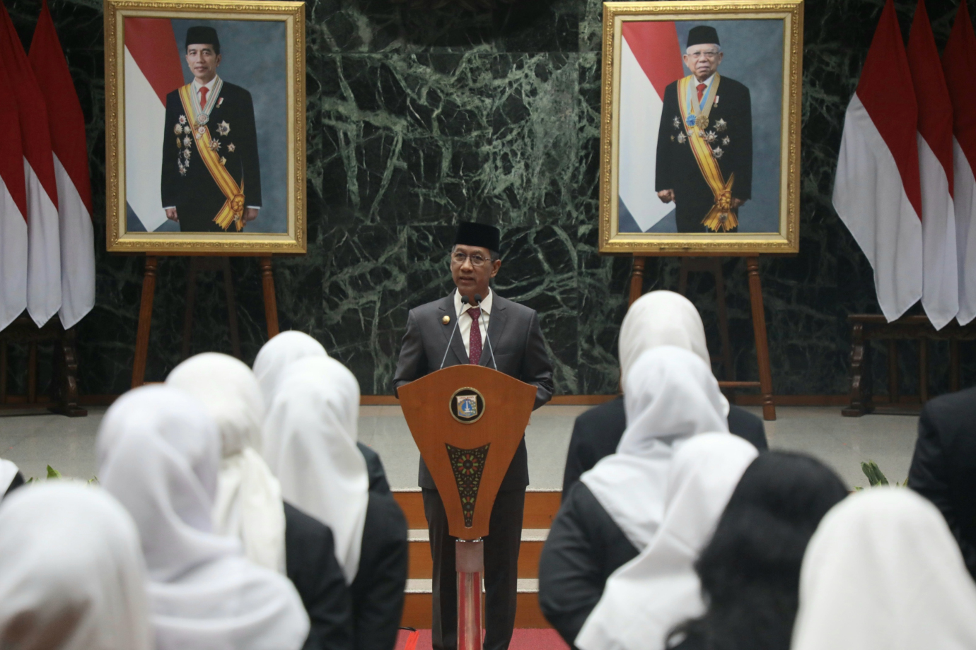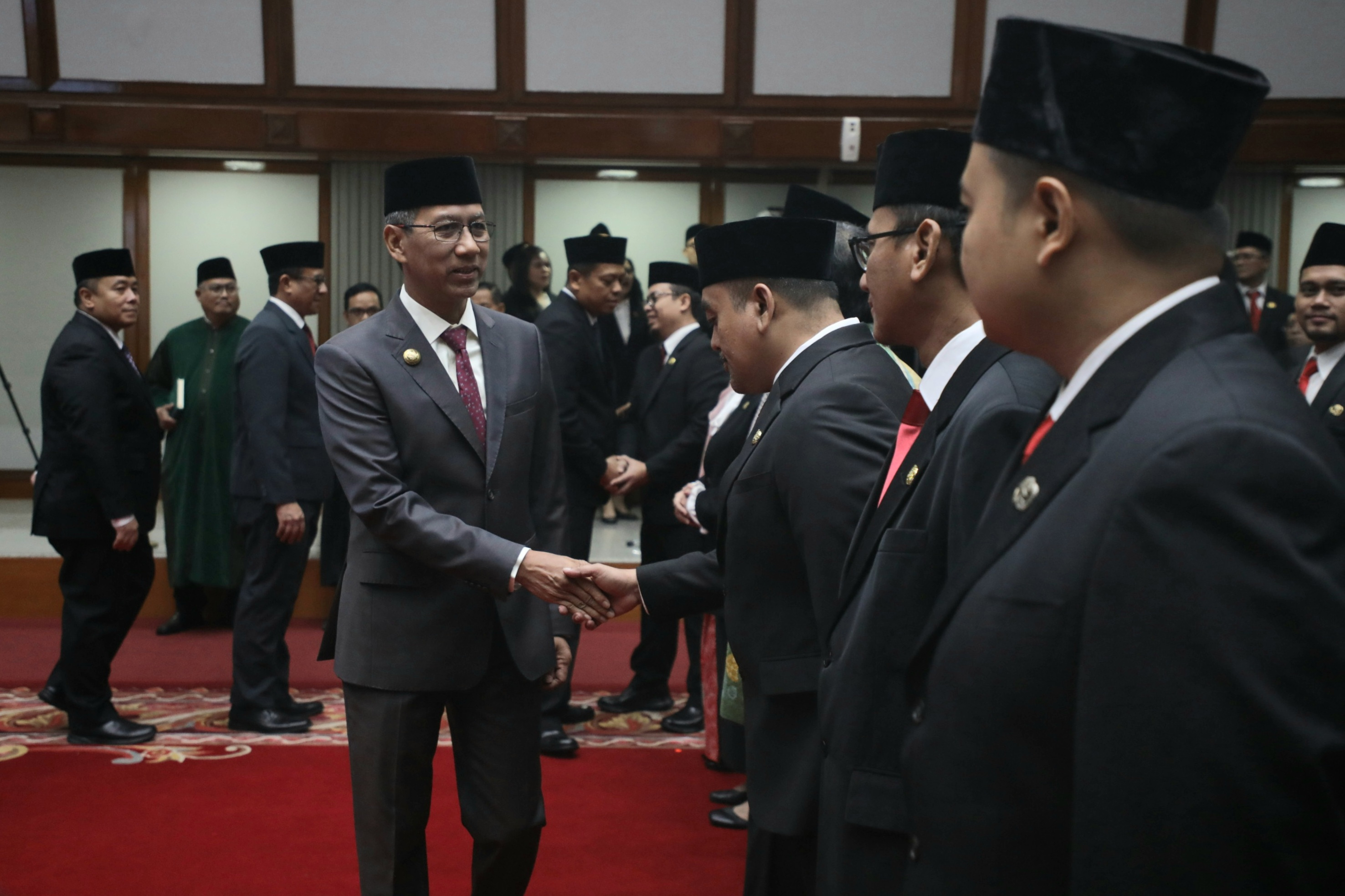 Penjabat (Pj) Gubernur DKI Jakarta, Heru Budi Hartono melantik 71 Pejabat Eselon II, III dan IV terdiri dari Pimpinan Tinggi Pratama, Administrator, Pengawas dan Ketua subkelompok di Balai Agung, Balai Kota DKI Jakarta, Jalan Medan Merdeka Selatan, Gambir, Jakarta Pusat, Senin (29/7). 71 Pejabat yang dilantik terdiri dari tiga pejabat eselon II, 17 Pejabat eselon III, 38 pejabat eselon IV dan 13 pejabat Ketua Subkelompok yang tersebar di sejumlah instansi antara lain Badan Pendapatan Daerah, Dinas Pemuda dan Olahraga, Dinas Penanaman Modal dan Pelayanan Terpadu Satu Pintu, Dinas Pendidikan, Inspektorat, Badan Pengelolaan Keuangan Daerah, Badan Perencanaan Pembangunan Daerah dan Dinas PPKUKM.