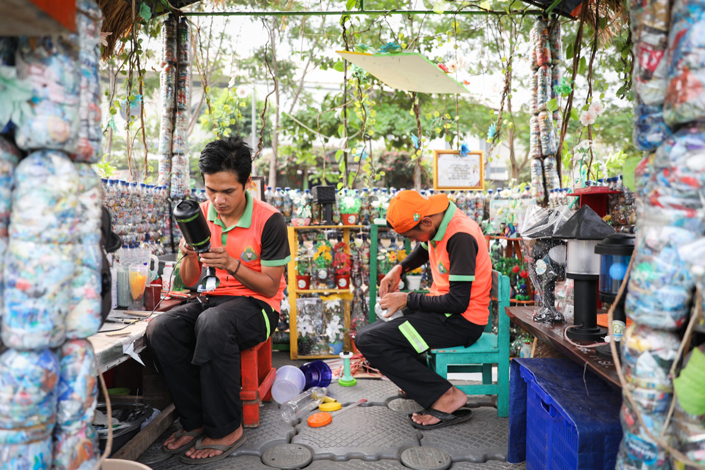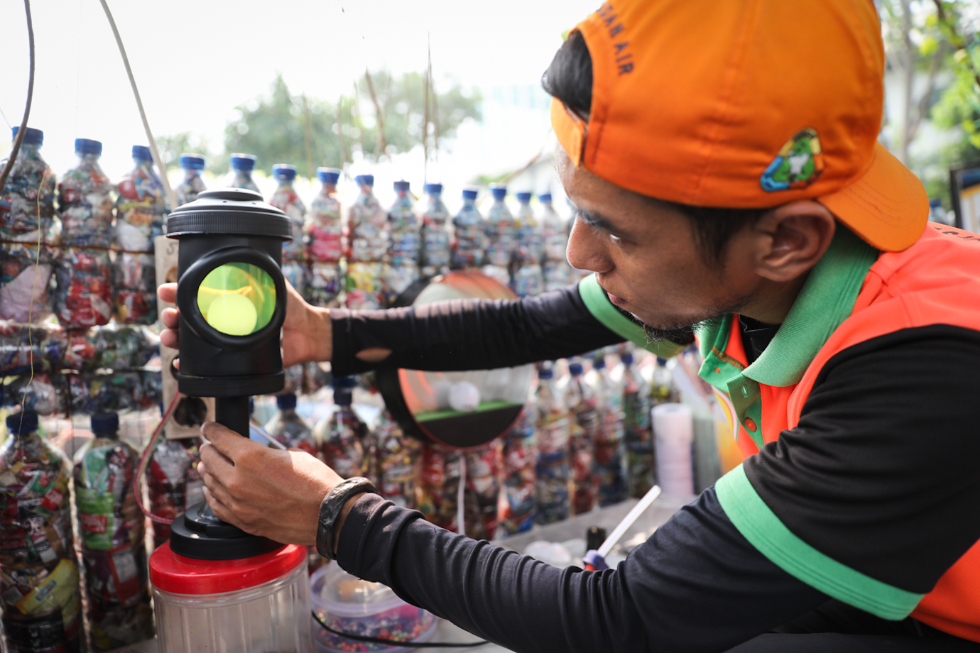 Petugas Unit Penanganan Sampah Badan Air (UPS BA) Dinas Lingkungan Hidup Kecamatan Cipayung membuat lampu tidur dari sampah di Waduk Setu, Cipayung, Jakarta Timur, Jumat (2/8). Pembuatan lampu tidur yang dinamai Lampu Rekreatif (Reusable-Kreatif) tersebut memanfaatkan sampah wadah makanan dan roll benang jahit yang sudah tidak terpakai.