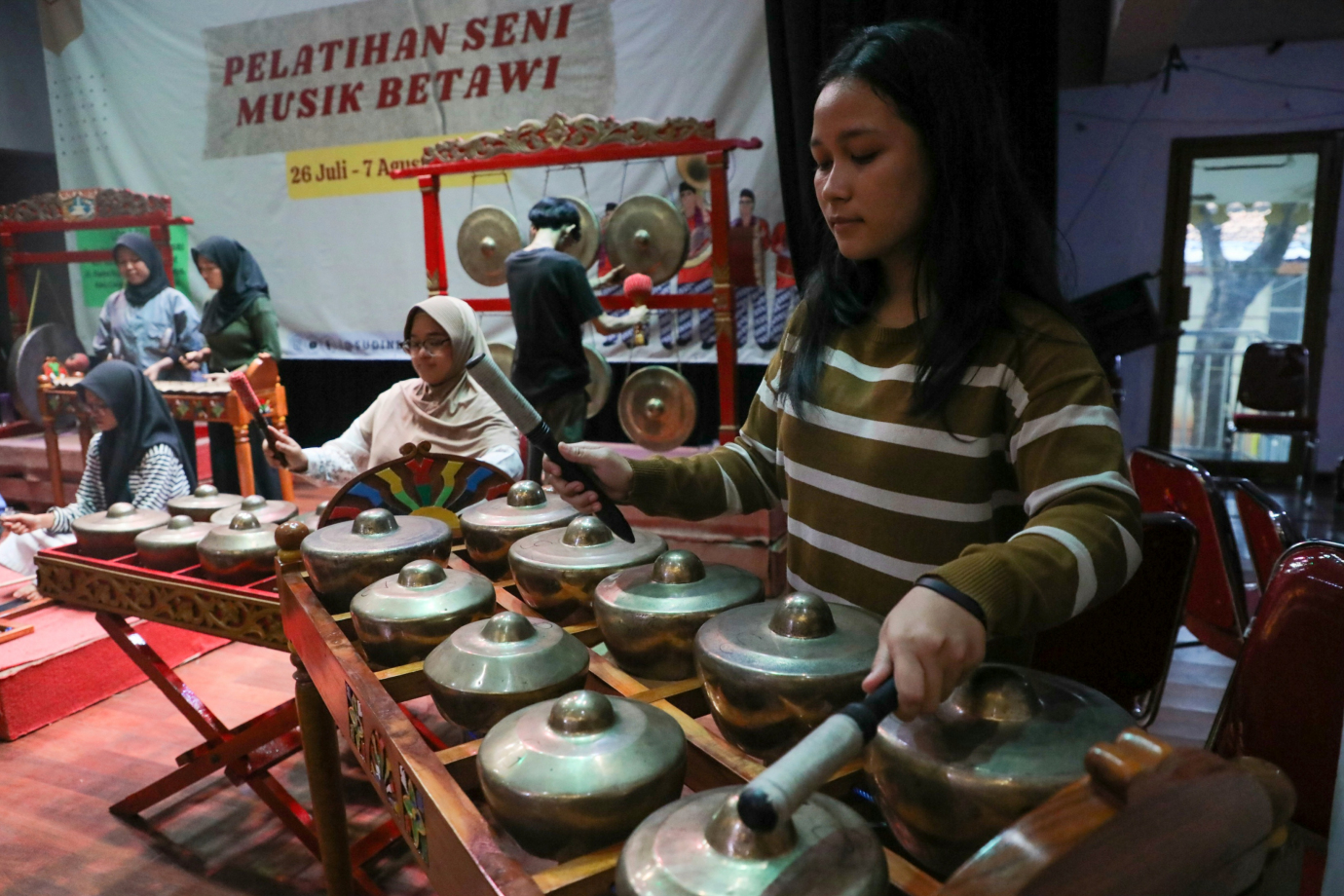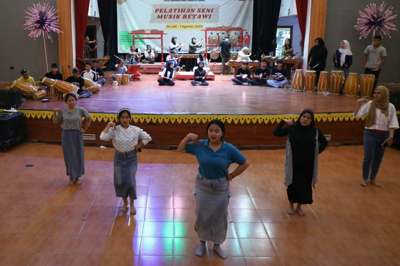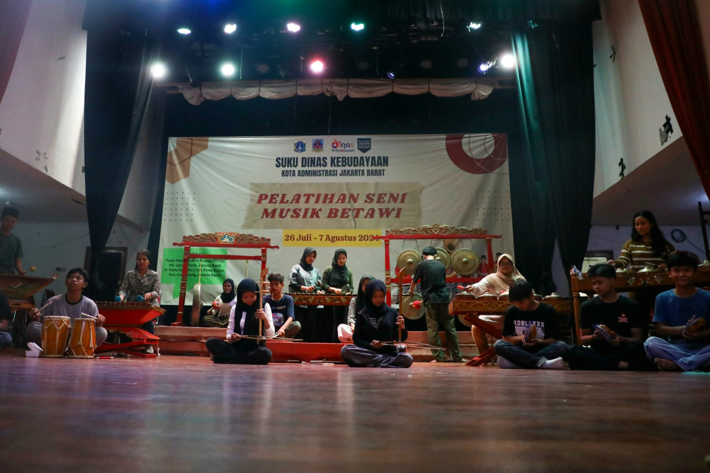 Suku Dinas (Sudin) Kebudayaan Jakarta Barat menggelar pelatihan seni musik betawi di Gedung Pusat Pelatihan Seni (PPSB), Ruang KH Usman Perak, Jalan Rama Raya, Kelurahan Rawa Buaya, Kecamatan Cengkareng, Jakarta Barat, Senin (5/8). Pelatihan yang digelar selama 10 hari kerja ini dimulai dari 26 Juli hingga 7 Agustus 2024, diikuti 30 peserta dari kalangan pelajar dan mahasiswa yang berasal dari wilayah Jakarta Barat.