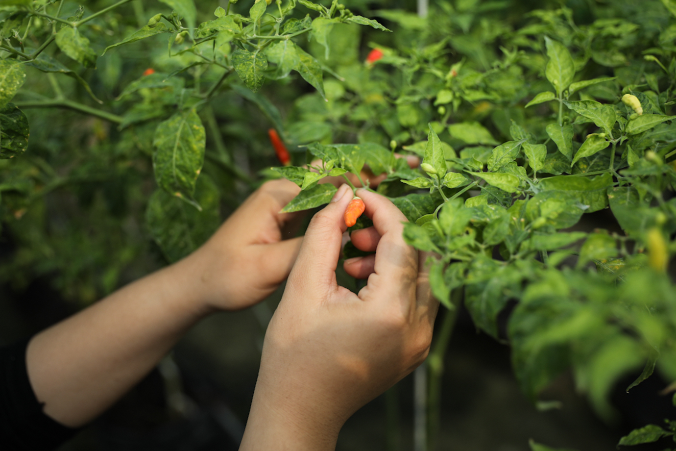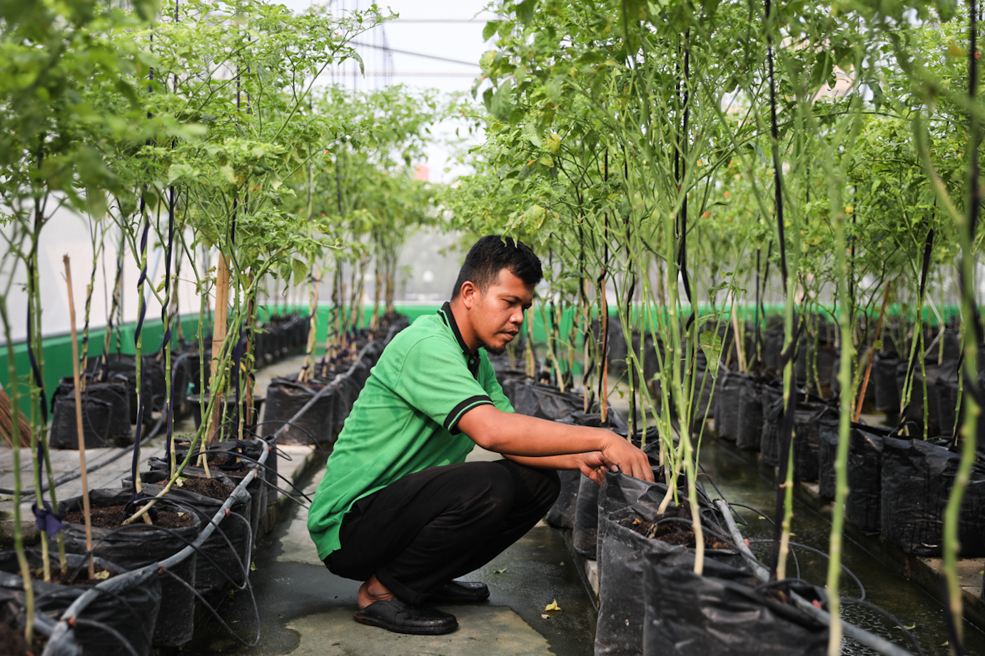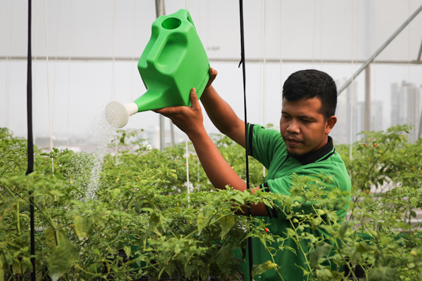 Petugas merawat tanaman cabai rawit merah di lantai atap (rooftop) Pasar Mayestik, Kebayoran Baru, Jakarta Selatan, Senin (5/8). Pemanfaatan rooftop Pasar Mayestik sebagai lokasi pertanian perkotaan (urban farming) akan dijadikan percontohan bagi pasar-pasar lain di bawang pengelolaan Perumda Pasar Jaya.