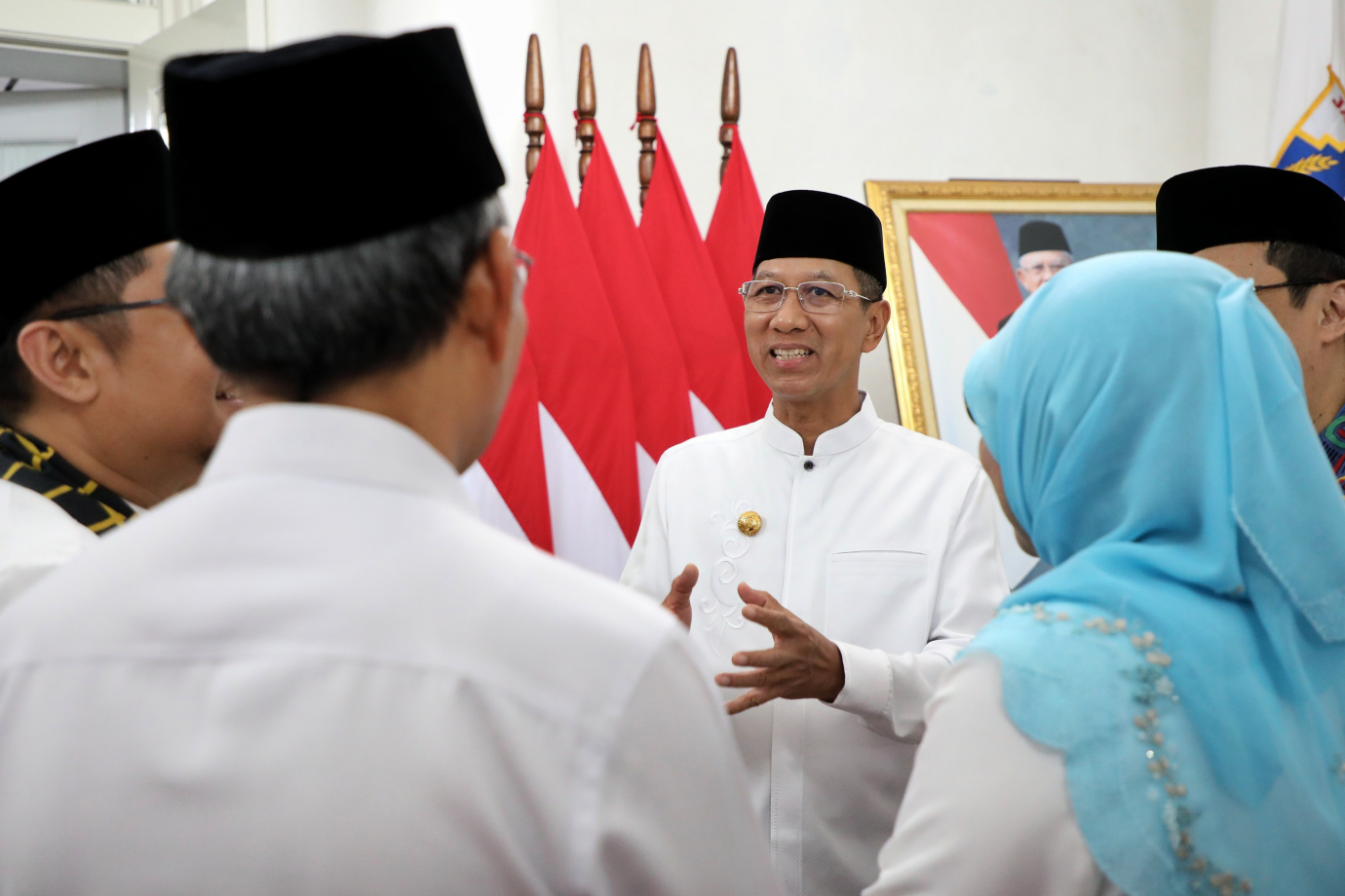 Penjabat (Pj) Gubernur DKI Jakarta, Heru Budi Hartono memberikan hadiah berupa umrah kepada 20 orang marbut masjid Jakarta di Balairung, Balai Kota DKI Jakarta, Gambir, Jakarta Pusat, Jumat (9/8). Pemberian hadiah umrah ini merupakan bentuk kepedulian kepada para marbut yang sudah menjaga, memakmurkan dan menjaga rumah ibadah.