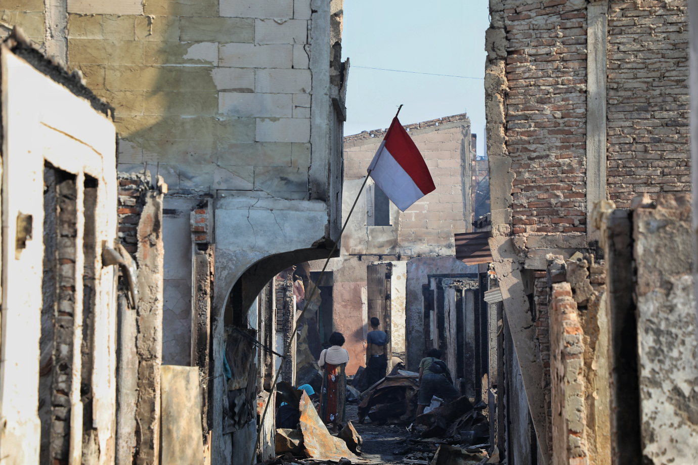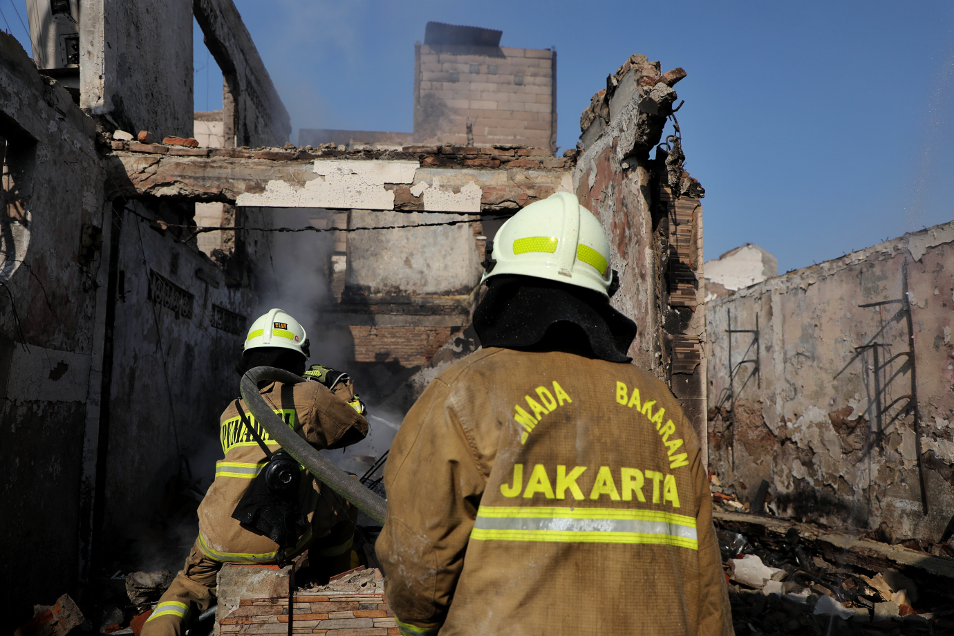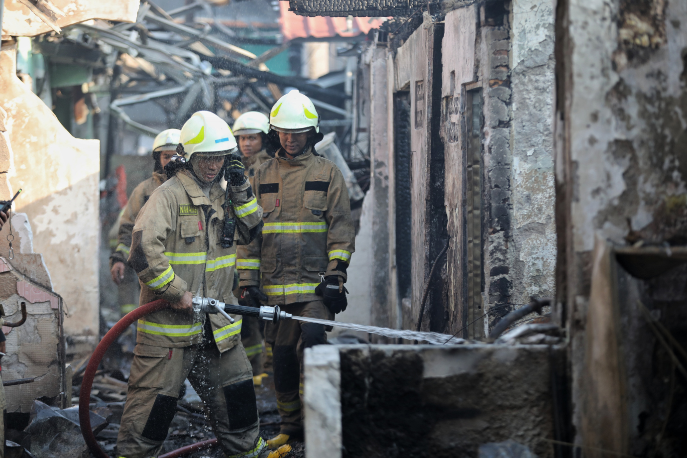 Petugas Dinas Penanggulangan Kebakaran dan Penyelamatan (Gulkarmat) melakukan proses pendinginan pasca kebakaran di kawasan Manggarai, Tebet, Jakarta Selatan, Selasa (13/8). Dalam penanganan kebakaran kali ini, Dinas Penanggulangan Kebakaran dan Penyelamatan (Gulkarmat) mengerahkan sebanyak 126 personel dengan 36 unit armada untuk mengatasi kebakaran tersebut.