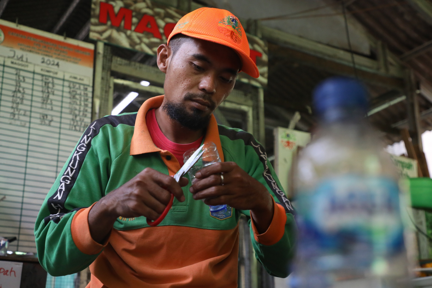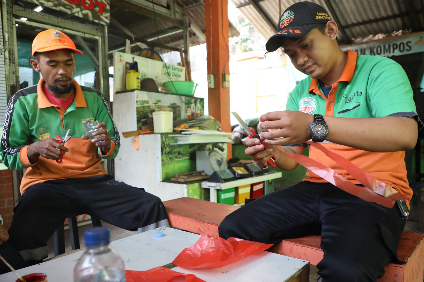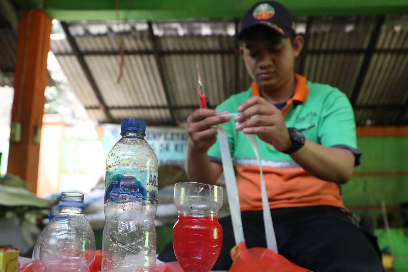 Dalam Rangka menyambut Hari Ulang Tahun ke-79 Republik Indonesia petugas Satuan Pelaksana Lingkungan Hidup (Satpel LH) Kecamatan Gambir mengubah sampah botol bekas menjadi hiasan gantungan bernuansa merah putih di Tempat Pengolahan Sampah Reduce, Reuse and Recycle (TPS 3R) Ketapang, Jalan Kyai Haji Zainul Arifin, Kelurahan Duri Pulo, Jakarta Pusat, Rabu (14/8). Dalam satu hari petugas dapat membuat hingga 30 hiasan gantungan dengan menggunakan 60 botol bekas yang didapat dari warga sekitar.
