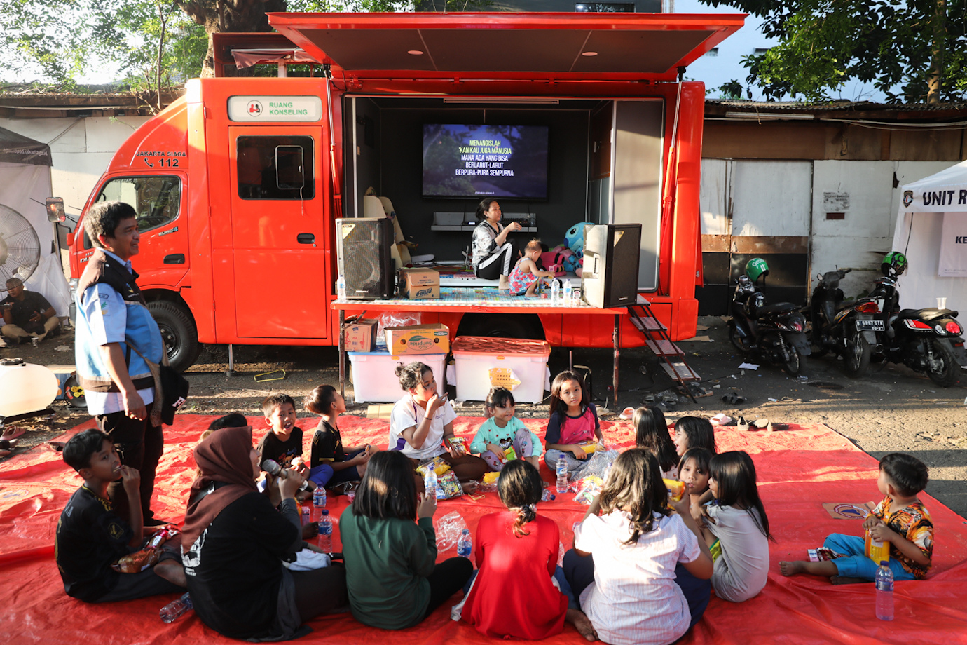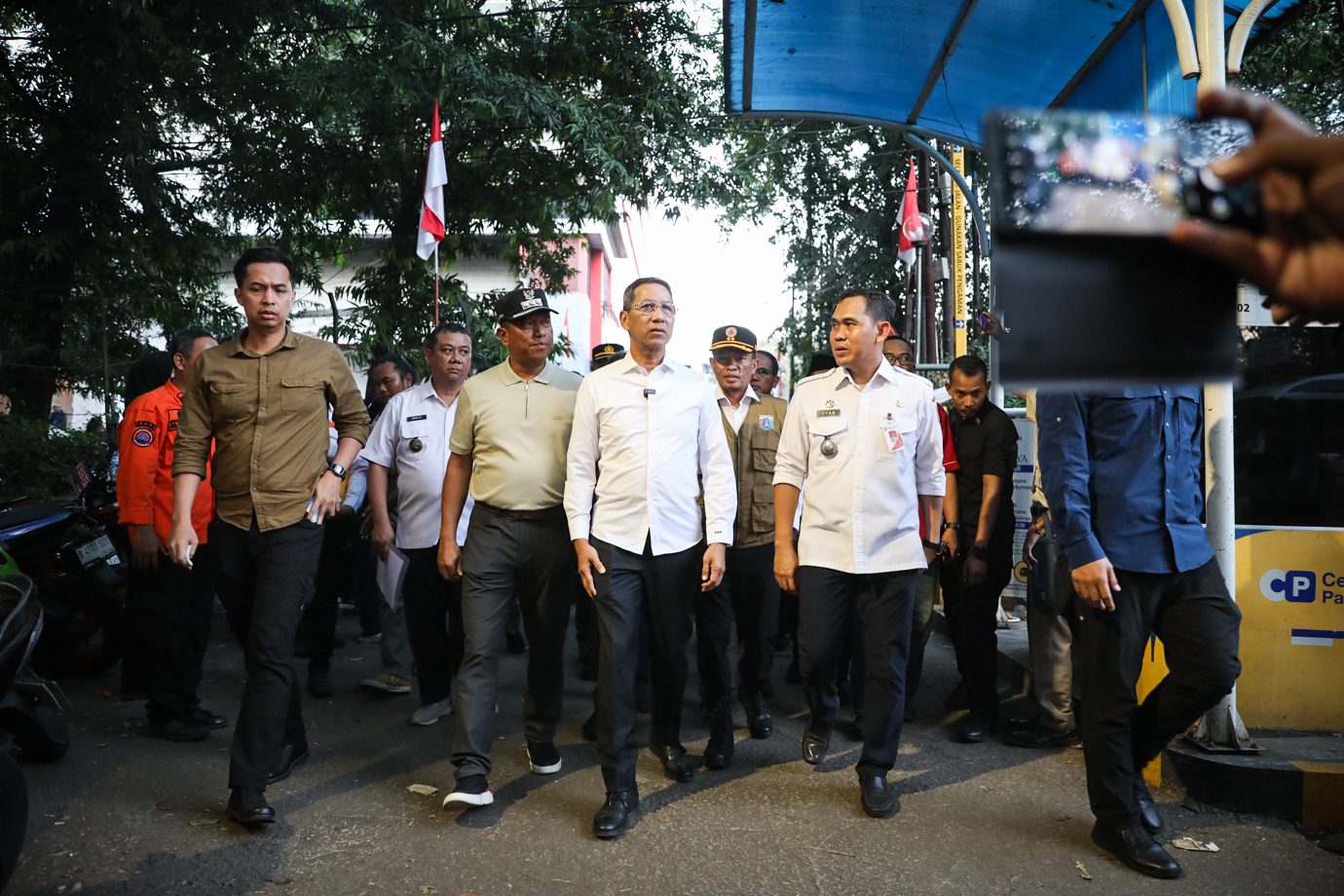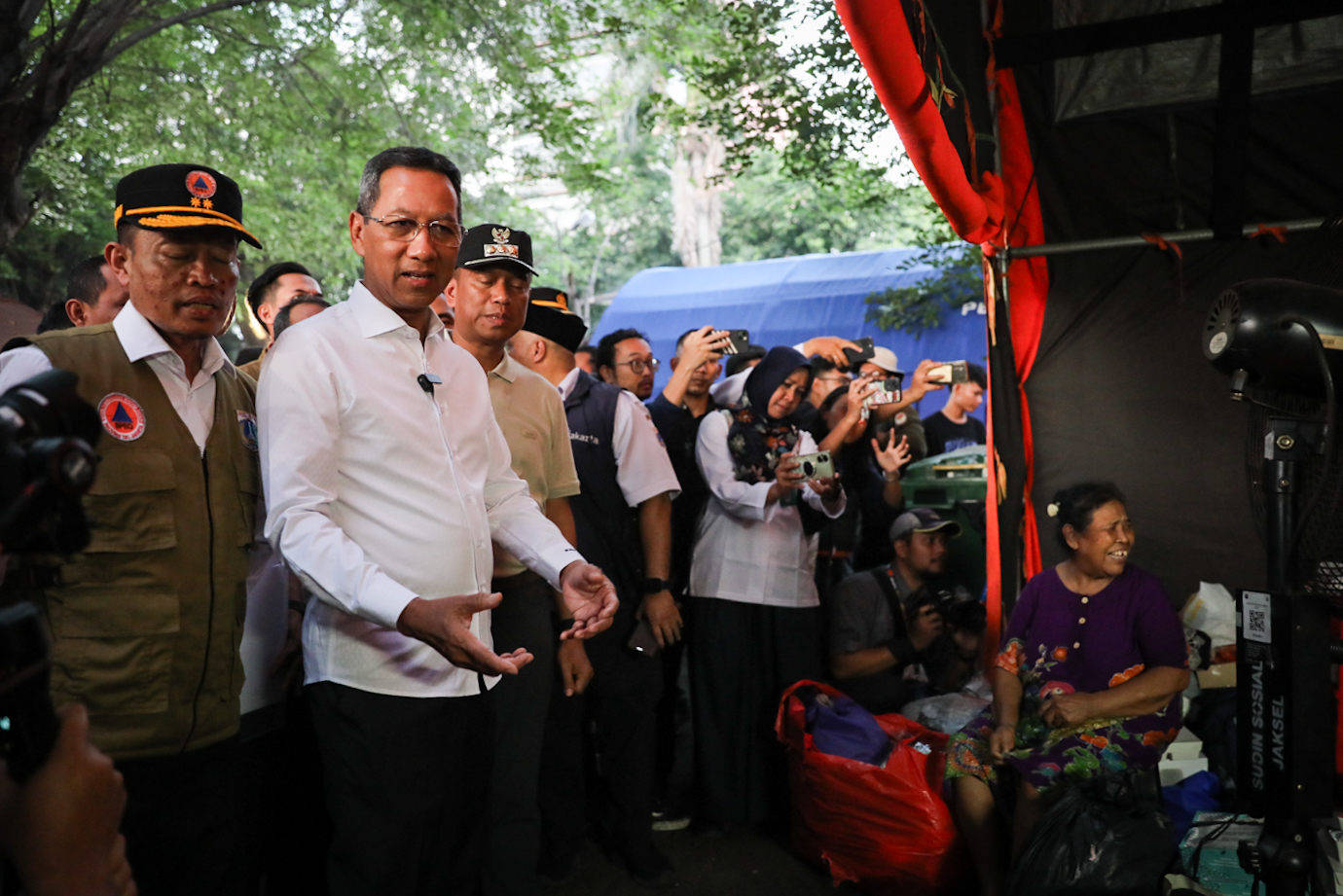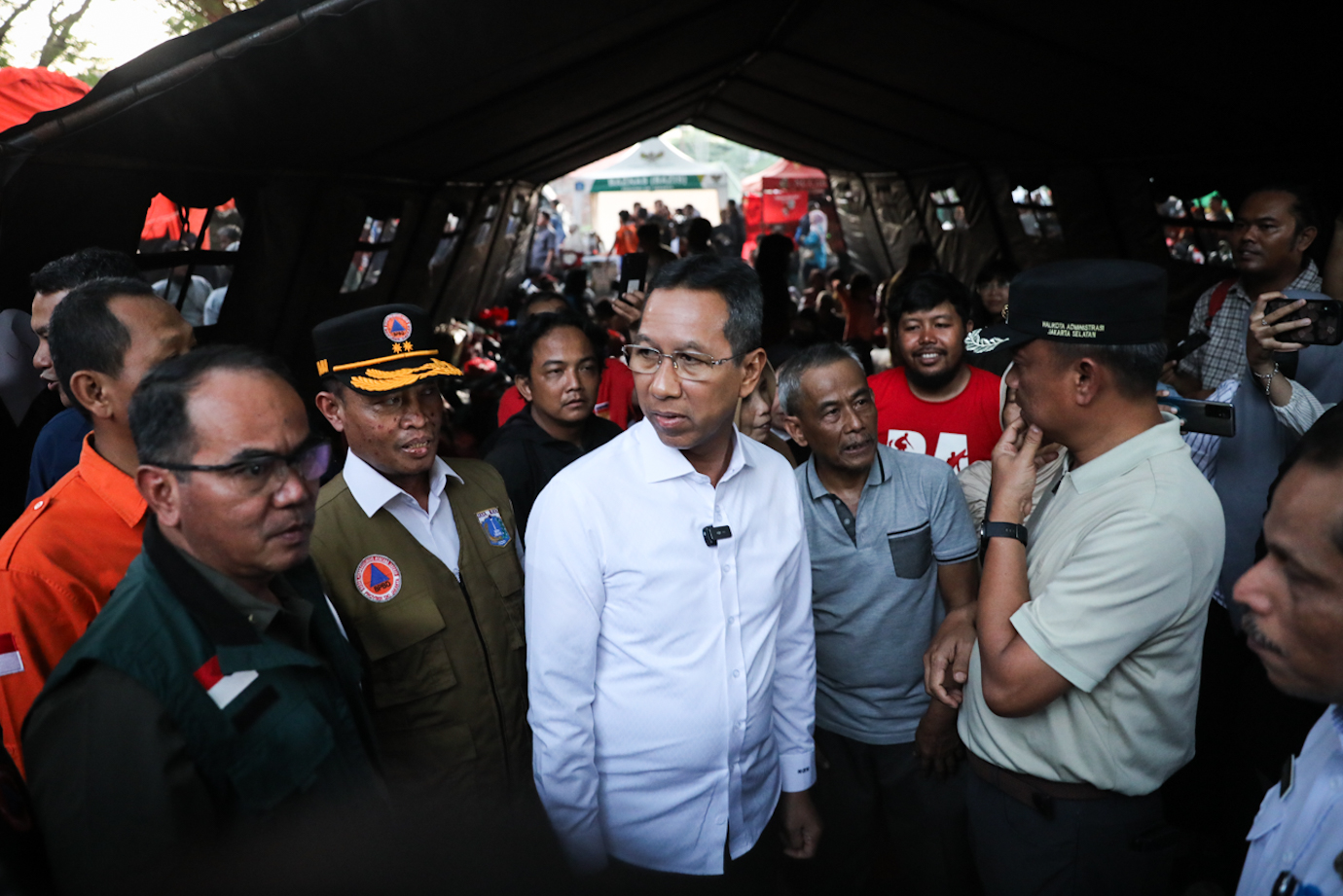 Penjabat (Pj) Gubernur DKI Jakarta, Heru Budi Hartono mengunjungi lokasi pengungsian warga terdampak kebakaran Manggarai di area parkir Pasaraya Manggarai, Jakarta Selatan, Rabu (14/8). Kunjungan Pj Gubernur untuk memastikan penanganan Pemprov DKI melalui SKPD terkait terhadap warga terdampak bencana kebakaran berjalan optomal.