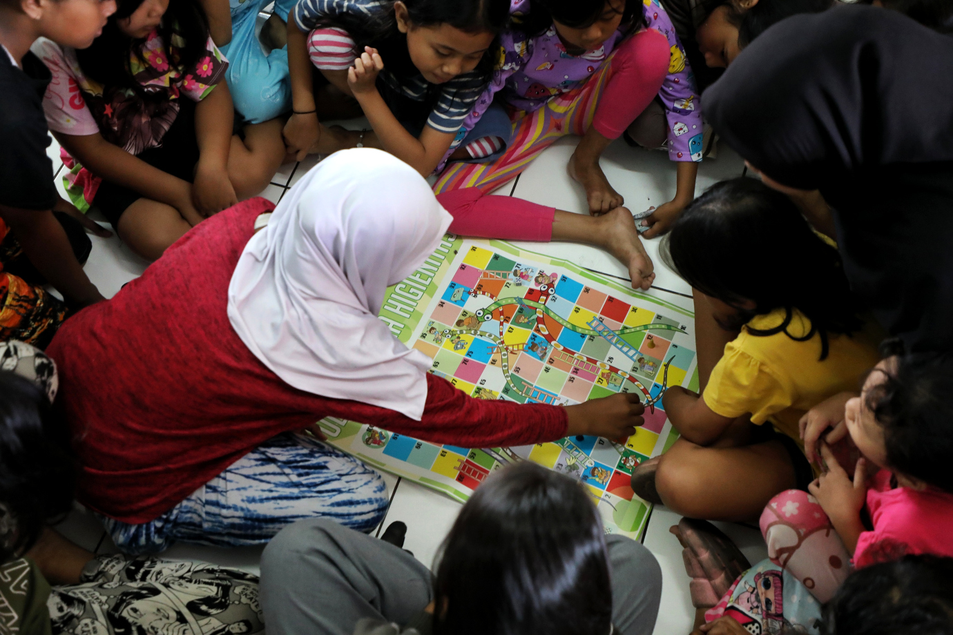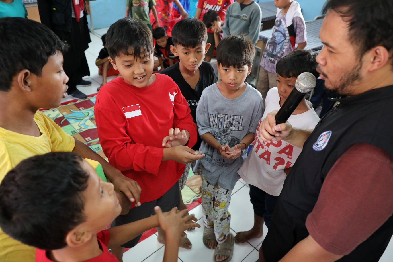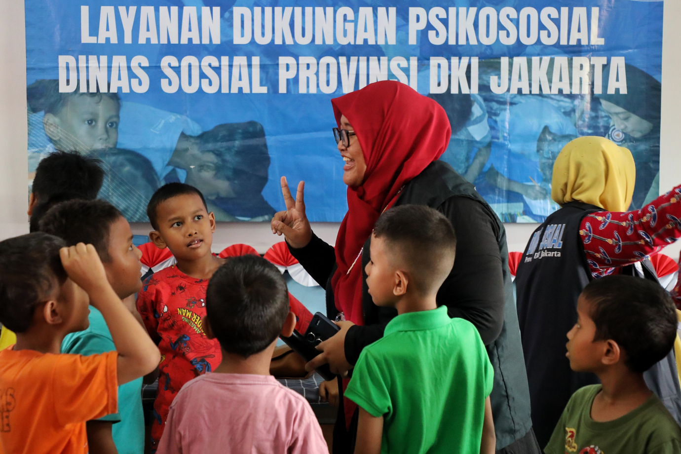 Dinas Sosial Provinsi DKI Jakarta memberikan Layanan Dukungan Psikososial (LDP) kepada anak-anak penyintas kebakaran di SDN Manggarai 05, Kelurahan Manggarai, Tebet, Jakarta Selatan, Kamis (15/8). Layanan psikososial ini dilakukan untuk mengembalikan kesehatan anak-anak terutama kesehatan mental agar tidak mengalami trauma berkepanjangan pasca terjadinya kebakaran yang menghanguskan rumah mereka.