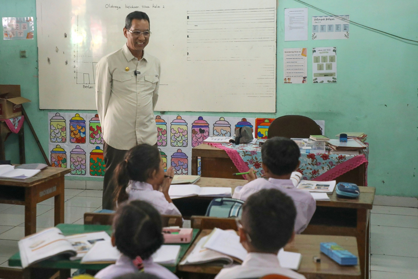 Penjabat (Pj) Gubernur DKI Jakarta, Heru Budi Hartono melakukan kunjungan ke kompleks Sekolah Dasar Negeri (SDN) 07 Cideng, Jalan Sangihe, Kecamatan Gambir Jakarta Pusat, Senin (19/8). Dalam kunjungan ini Pj Gubernur meninjau uji coba makan bergizi gratis kepada 498 siswa di kompleks SDN Cideng 07, yang terdiri dari 288 siswa SDN 07 Cideng, 178 siswa SDN Duri Pulo 04, 12 siswa Sanggar Kegiatan Belajar Negeri 23 dan 20 siswa Kelompok Belajar Negeri 23.