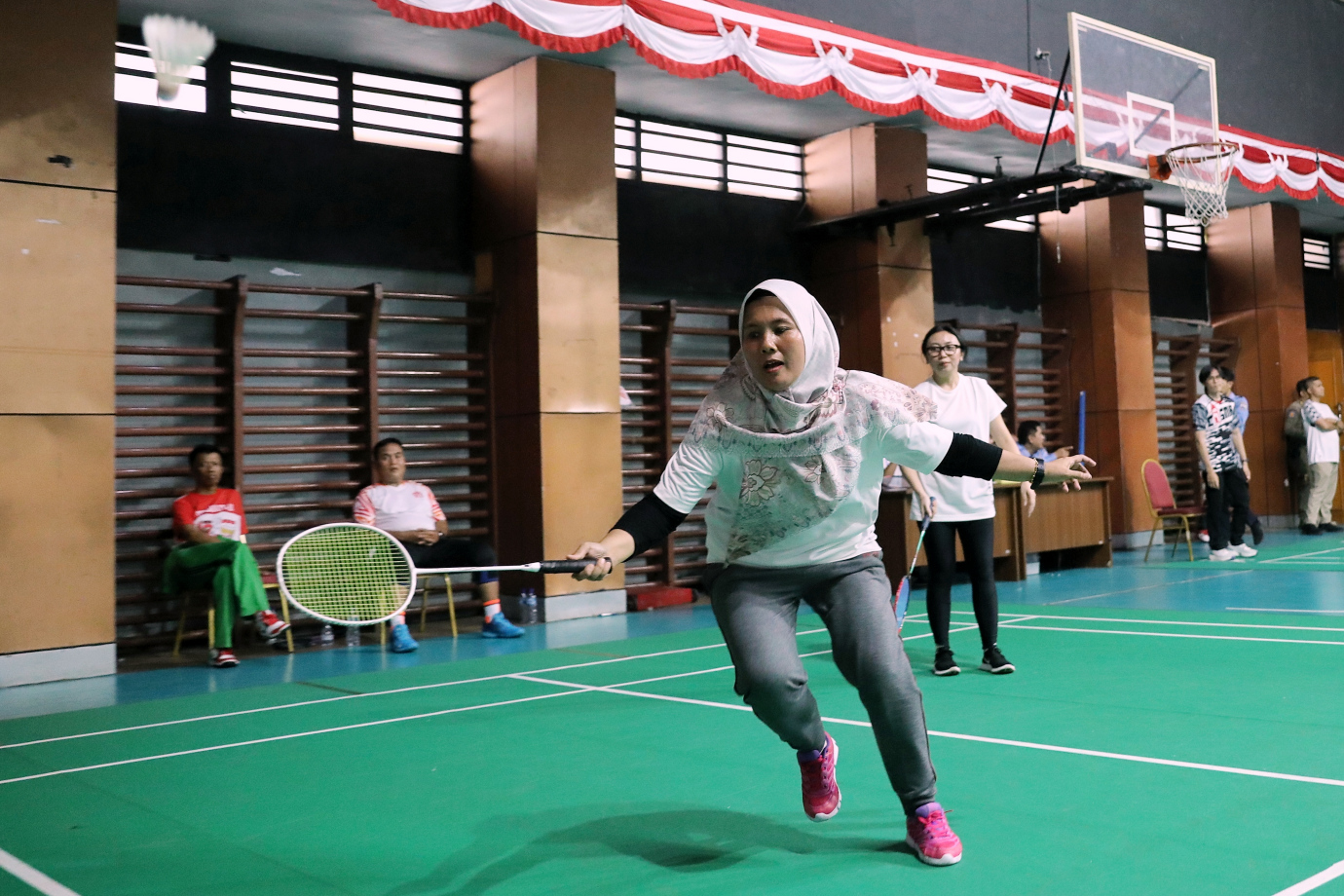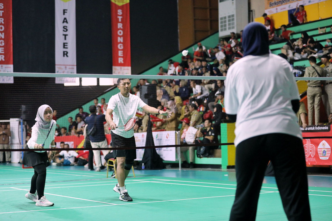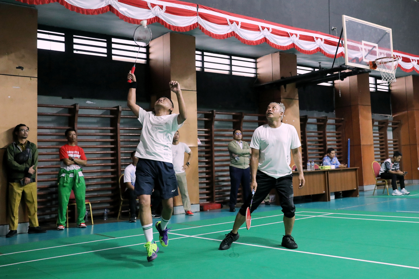 Dinas Kominfotik DKI Jakarta menjalani laga Piala Pj Gubernur DKI Jakarta 2024 pada kategori beregu campuran melawan Dinas Perhubungan DKI Jakarta di Gelanggang Remaja Jakarta Timur, Jatinegara, Senin (19/8). Pada kategori beregu campuran ini mempertandingkan Ganda Putra, Ganda Putri dan Ganda Campuran.