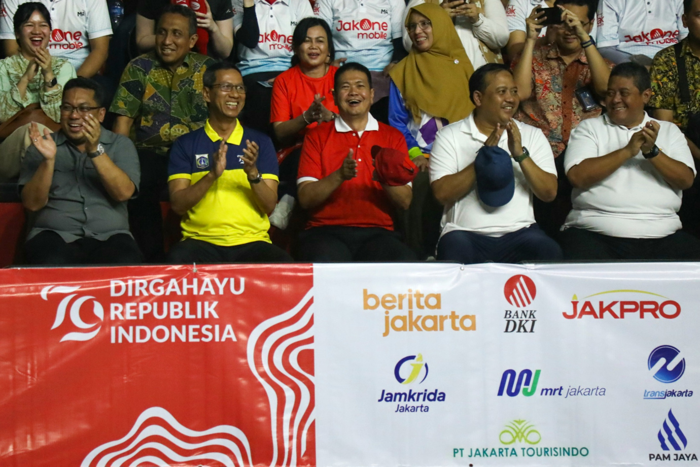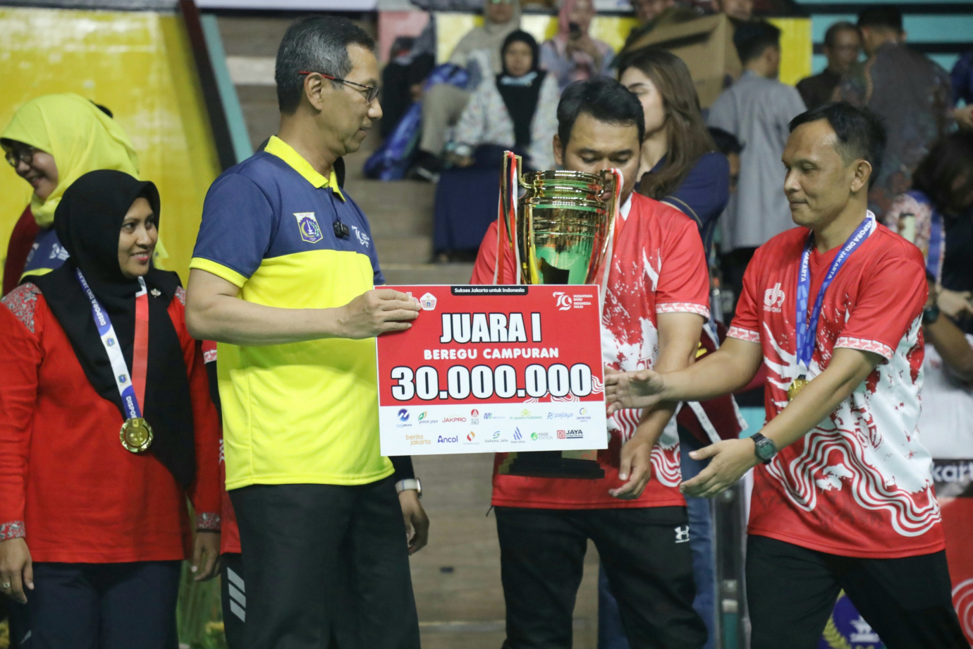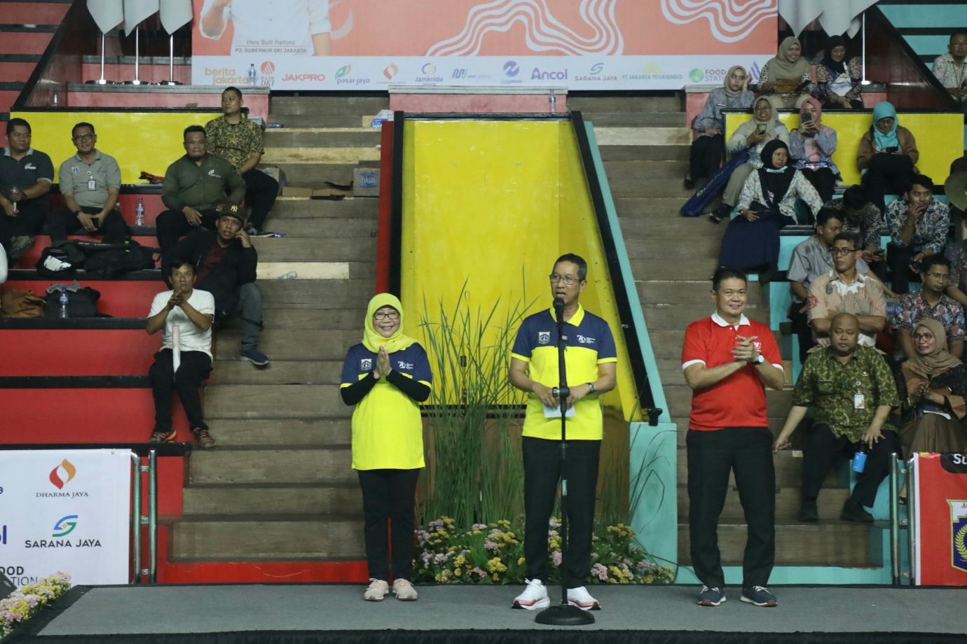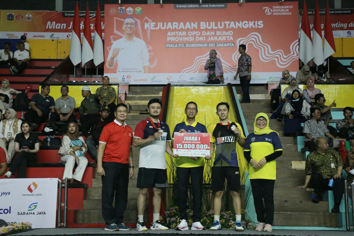 Penjabat (Pj) Gubernur DKI Jakarta, Heru Budi Hartono secara resmi menutup dan memberikan hadiah dan mengalungkan medali kepada pemenang kejuaraan bulutangkis Piala Pj Gubernur 2024 di Gelanggang Remaja Jakarta Timur, Kelurahan Bidara Cina, Kecamatan Jatinegara, Jakarta Timur, Kamis (22/8). Pemenang kategori perorangan ganda putri yakni, Juara 1, PT Pembangunan Jaya, Juara 2, Dinas Pendidikan, Juara 3, Wali Kota Administrasi Jakarta Timur dan Dinas Kesehatan, kategori perorangan ganda putra yakni, juara 1, PT Pembangunan Jaya, juara 2, Perumda Pasar Jaya, Juara 3, Dinas Pemuda dan Olahraga dan Dinas Pendidikan dan kategori beregu yakni Juara 1, Dinas Pemuda dan Olahraga, Juara 2, PT Bank DKI dan Juara 3, Dinas Pendidikan dan Wali Kota Administrasi Jakarta Barat.