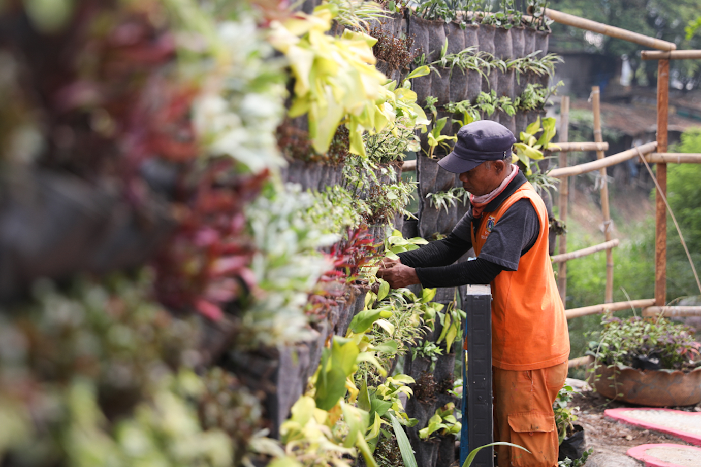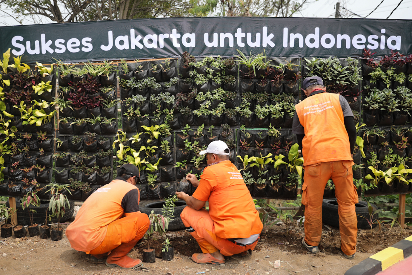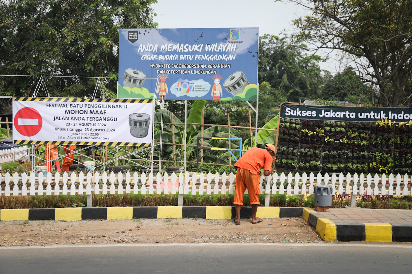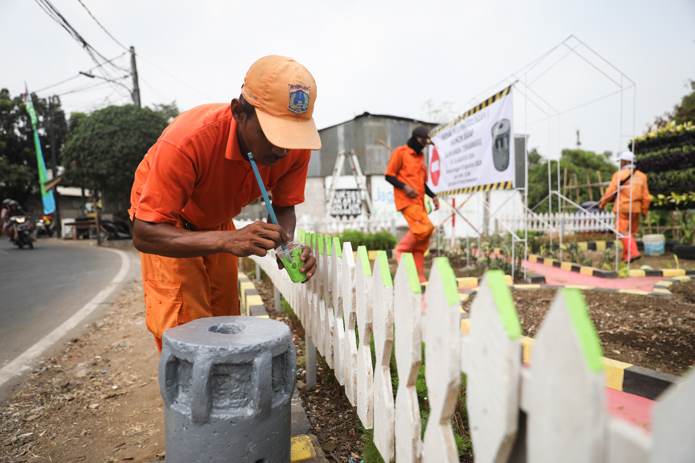 Petugas Penanganan Prasarana dan Sarana Umum (PPSU) Kelurahan Penggilingan mengerjakan penataan kawasan unggulan di Jalan Kali Buaran RT 10 RW 07, Cakung, Jakarta Timur, Jumat (23/8). Penataan kawasan unggulan triwulan III 2024 tersebut mengubah lahan yang sebelumnya ditempati oleh bangunan liar menjadi taman hijau seluas 300 meter persegi.